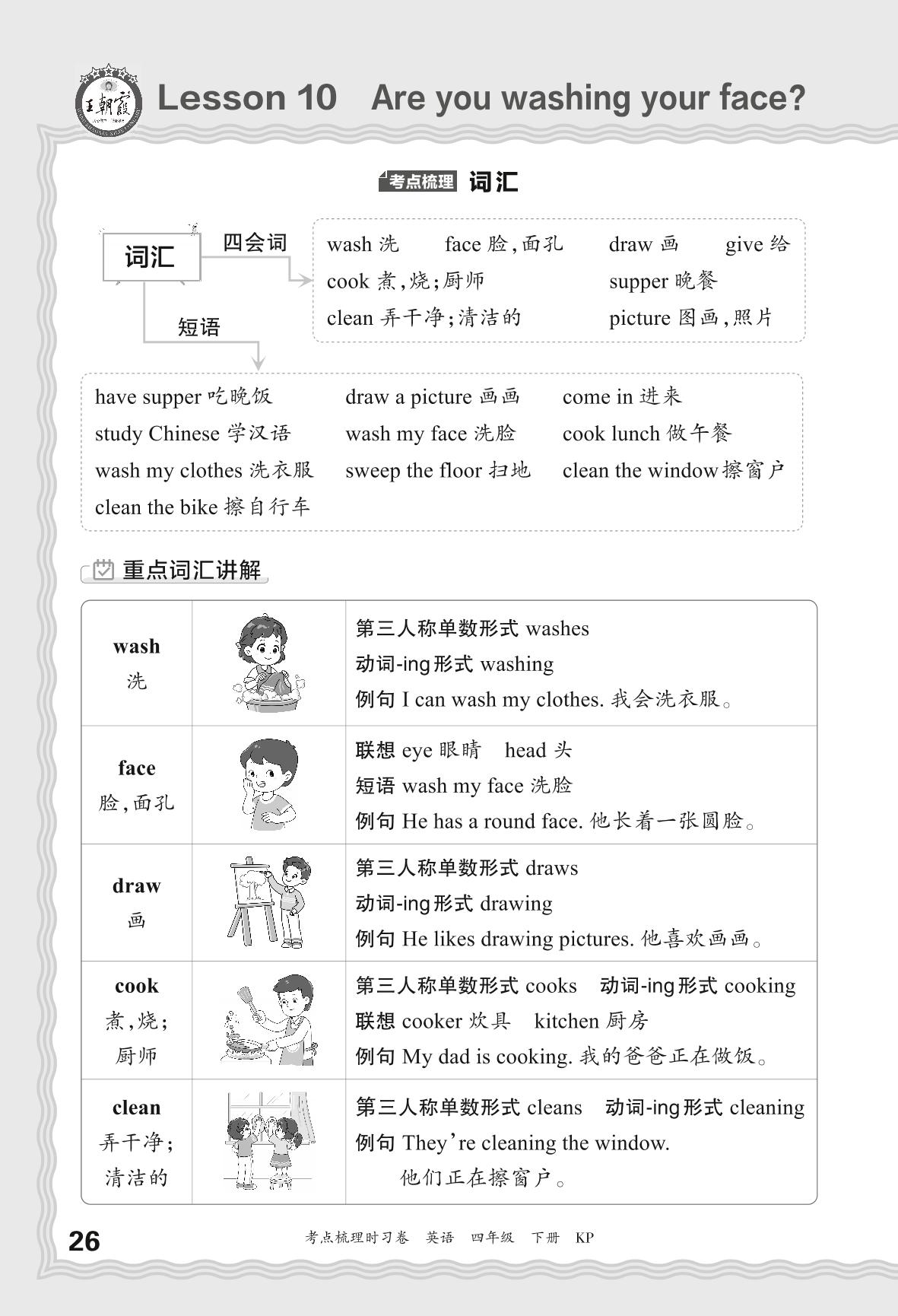 2024春下册四年级英语科普版 考点梳理手册——Lesson 10 Are you washing your face?