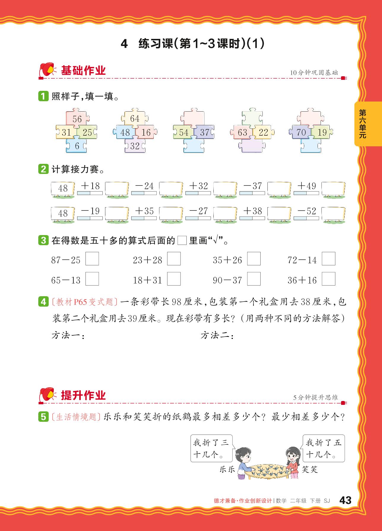 2024春下册二年级数学苏教版 第六单元 两、三位数的加法和减法——两位数加、减两位数的口算 两步计算的加减法实际问题练习课(1)_R240124101413173