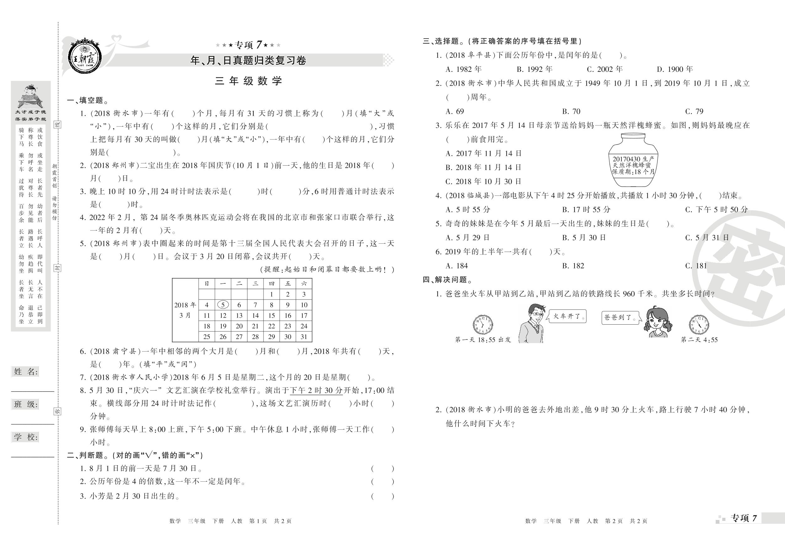 王朝霞期末专项——年、月、日 图形与统计真题归类复习卷三年级下册数学(人教版)_R210804100205【0】