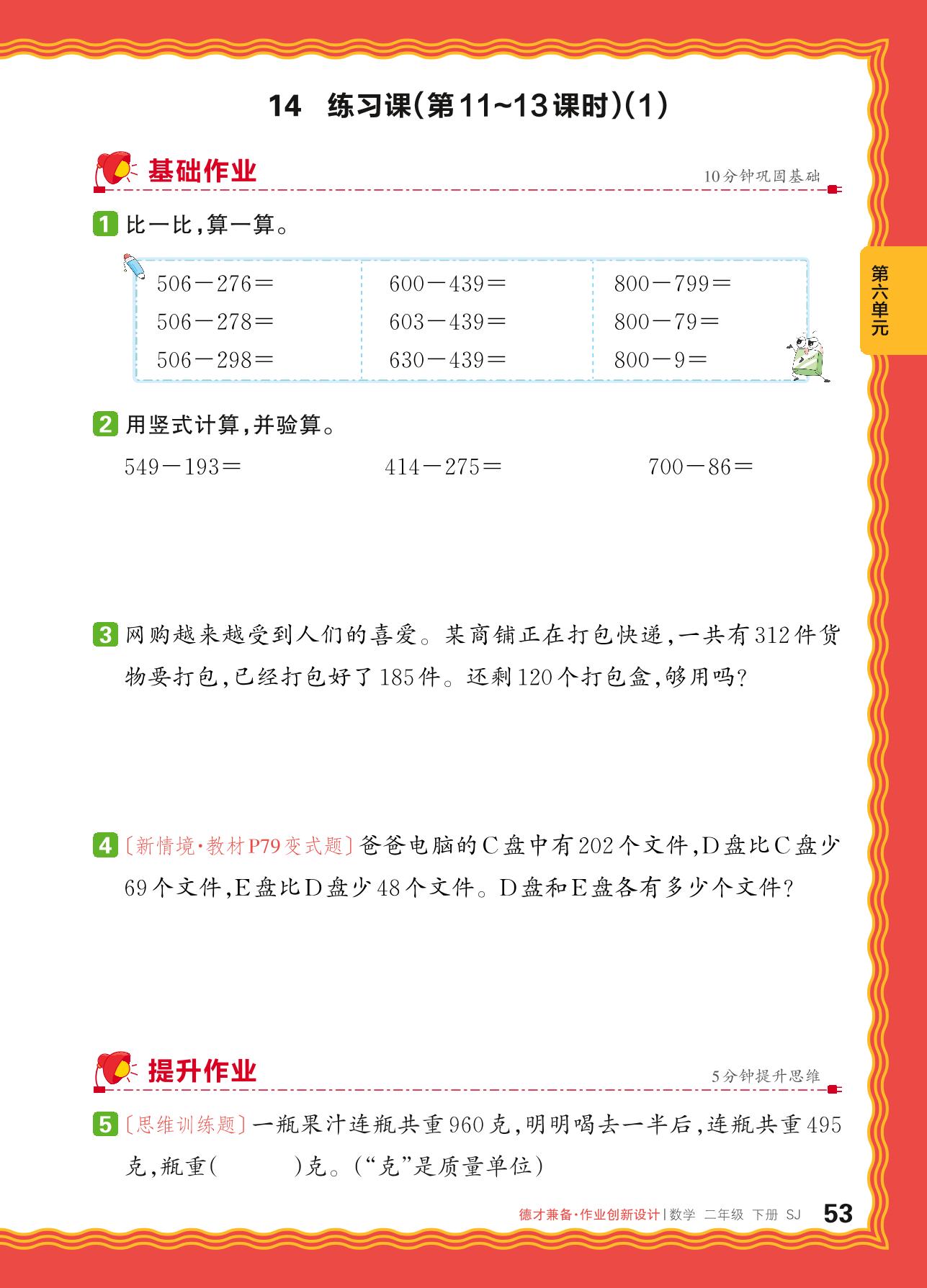 2024春下册二年级数学苏教版 第六单元 两、三位数的加法和减法——三位数减法的笔算练习课(1)_R240124101410081