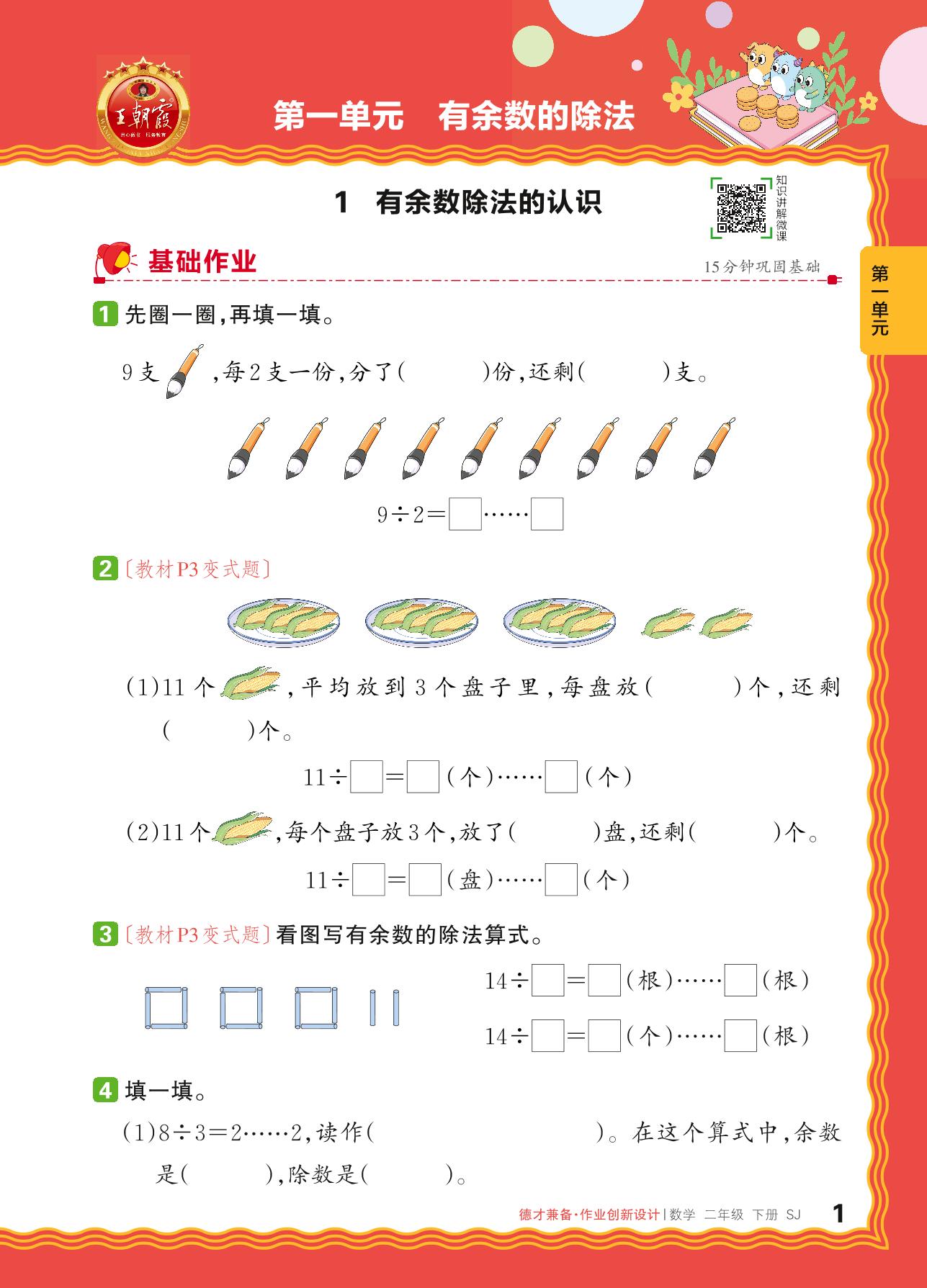 2024春下册二年级数学苏教版 第一单元 有余数的除法——1. 有余数除法的认识