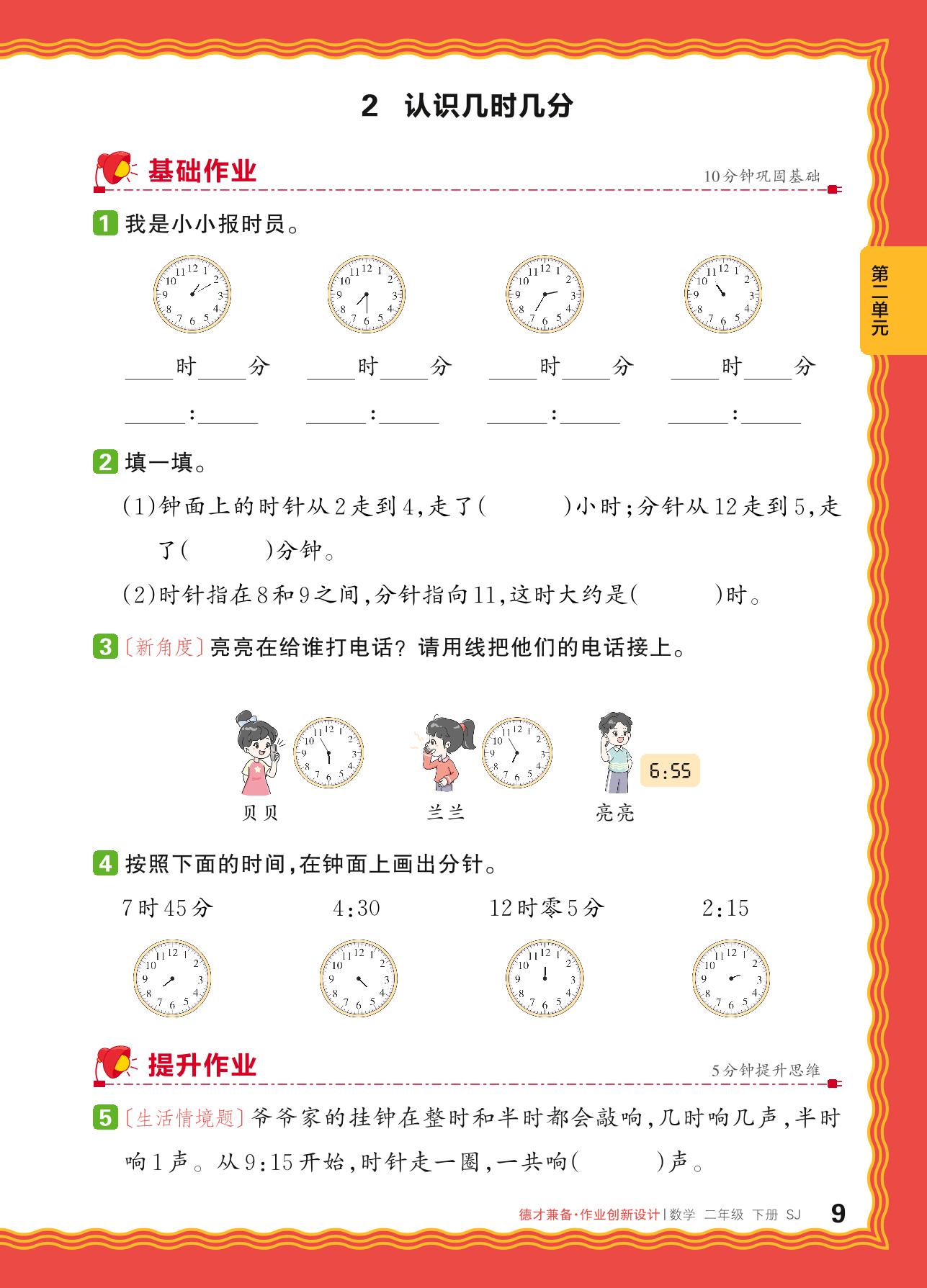 2024春下册二年级数学苏教版 第二单元 时、分、秒——2. 认识几时几分