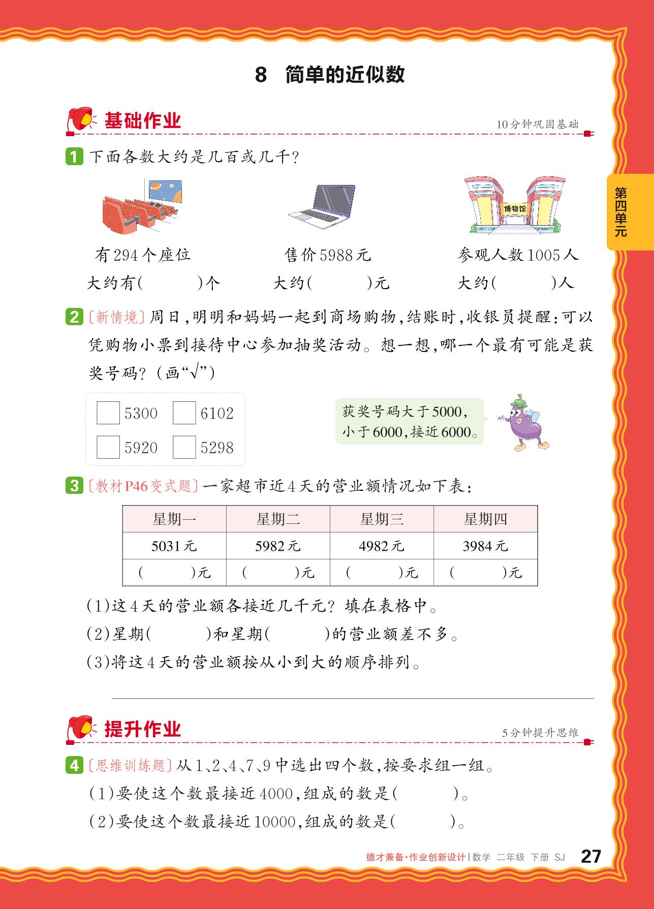 2024春下册二年级数学苏教版 第四单元 认识万以内的数——8. 简单的近似数