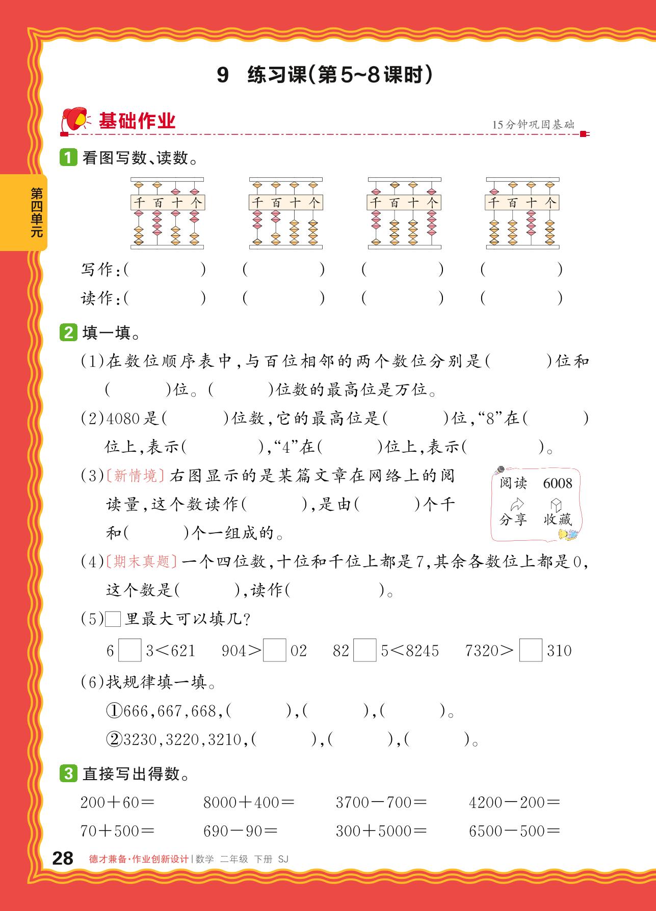 2024春下册二年级数学苏教版 第四单元 认识万以内的数——万以内数的认识、万以内数的大小比较、简单的近似数练习课
