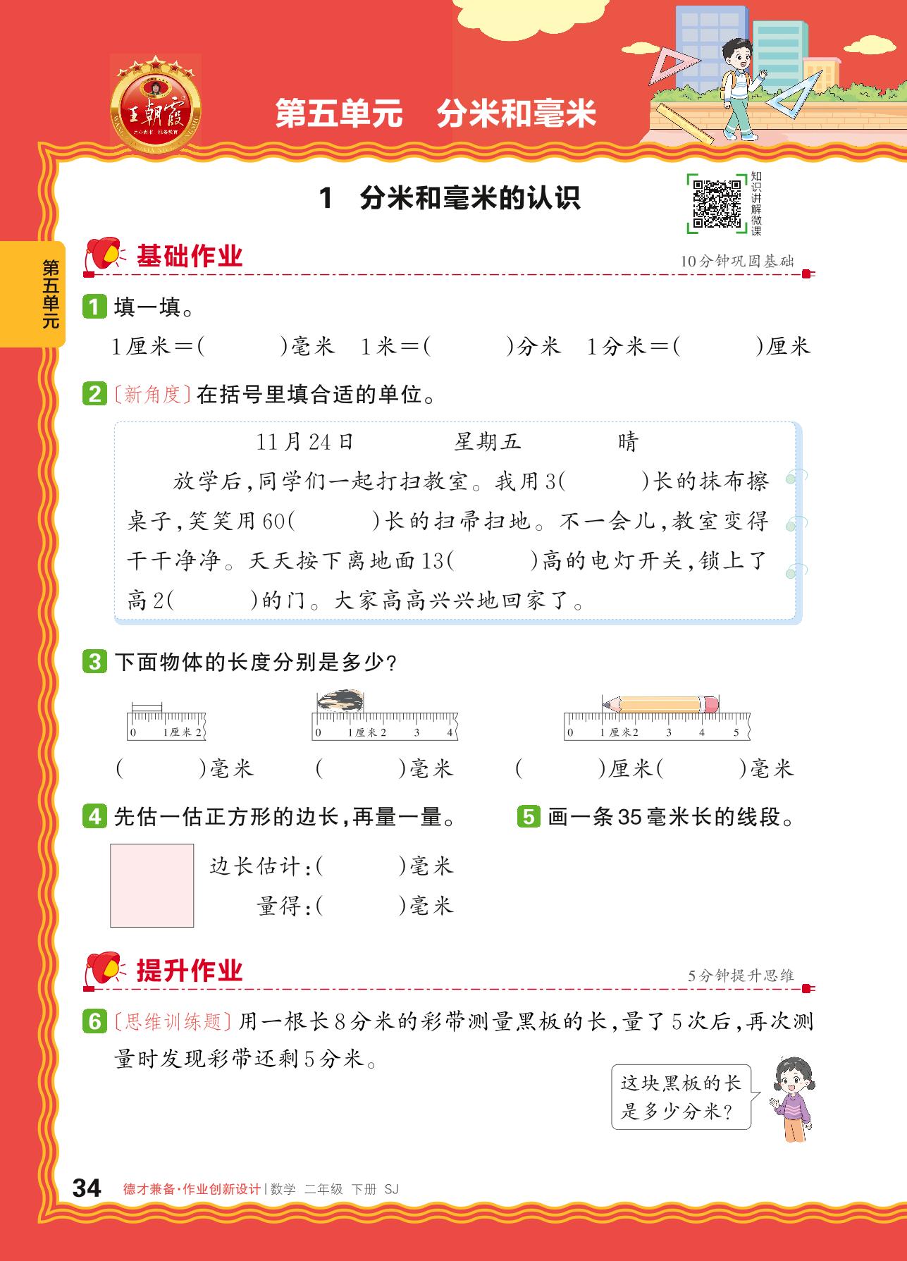 2024春下册二年级数学苏教版 第五单元 分米和毫米——1. 分米和毫米的认识