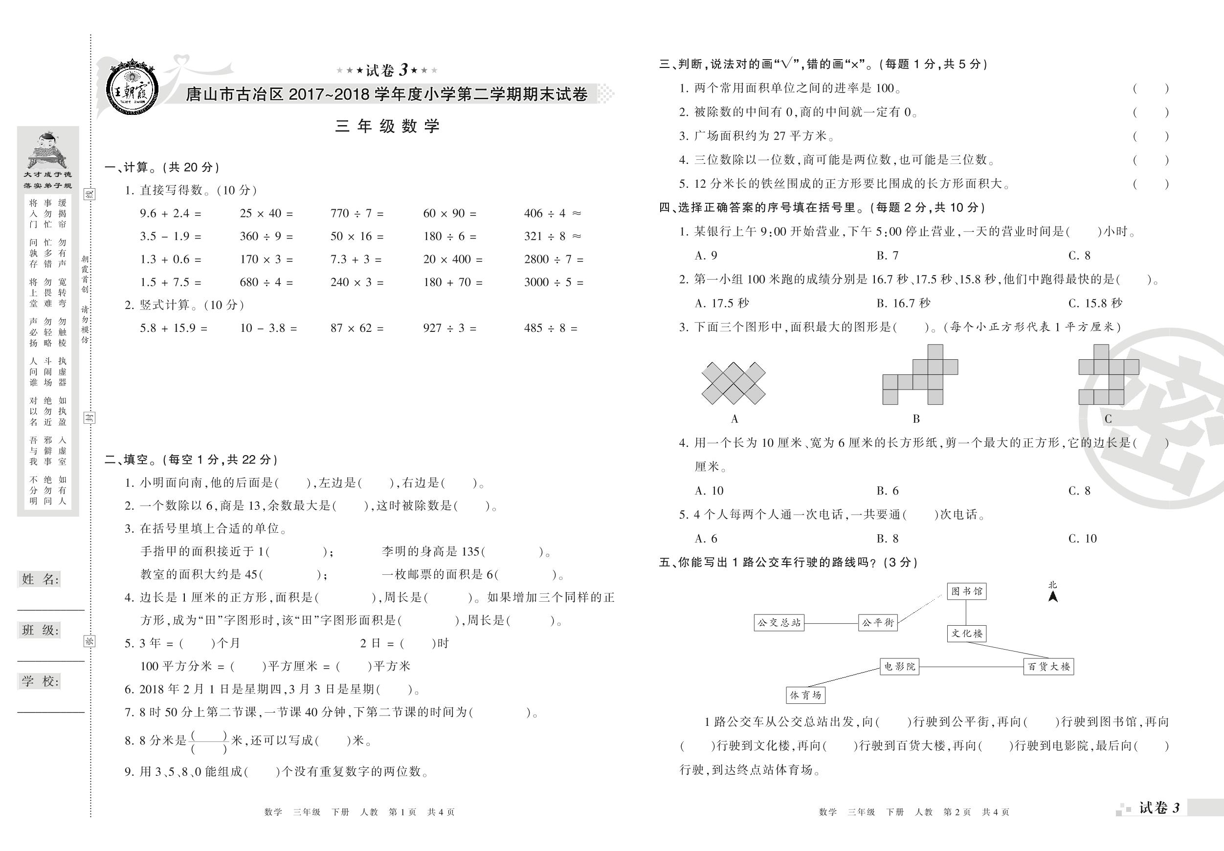 2017-2018学年第二学期唐山市古冶区三年级数学试卷(人教版)【3】