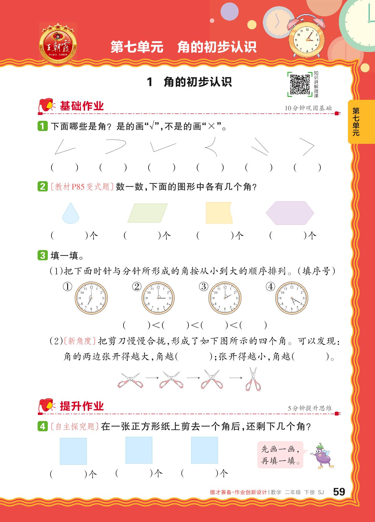 2024春下册二年级数学苏教版 第七单元 角的初步认识——1. 角的初步认识