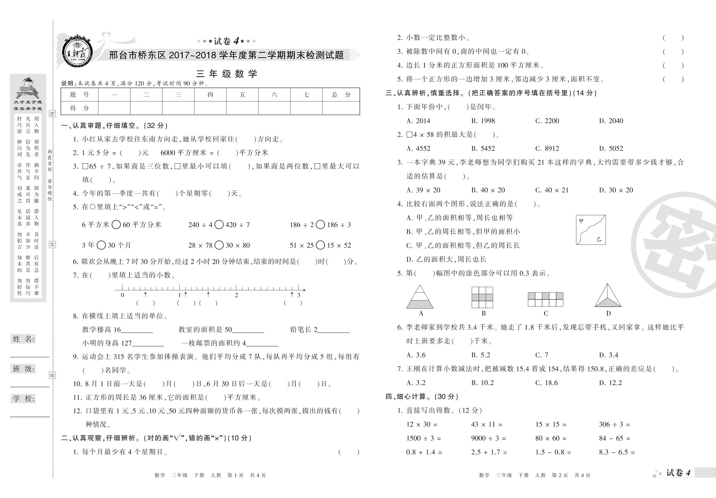 2017-2018学年第二学期邢台市桥东区三年级数学试卷(人教版)【4】