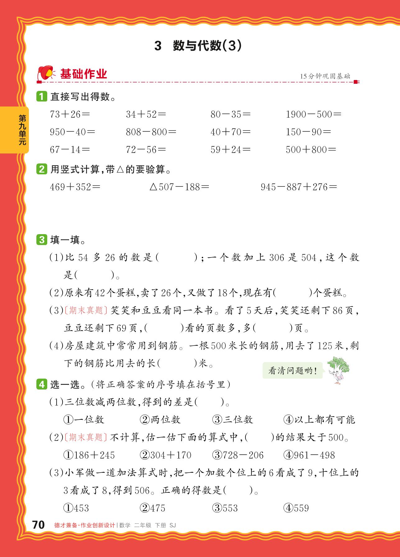 2024春下册二年级数学苏教版 第九单元 期末复习——3. 数与代数(3)
