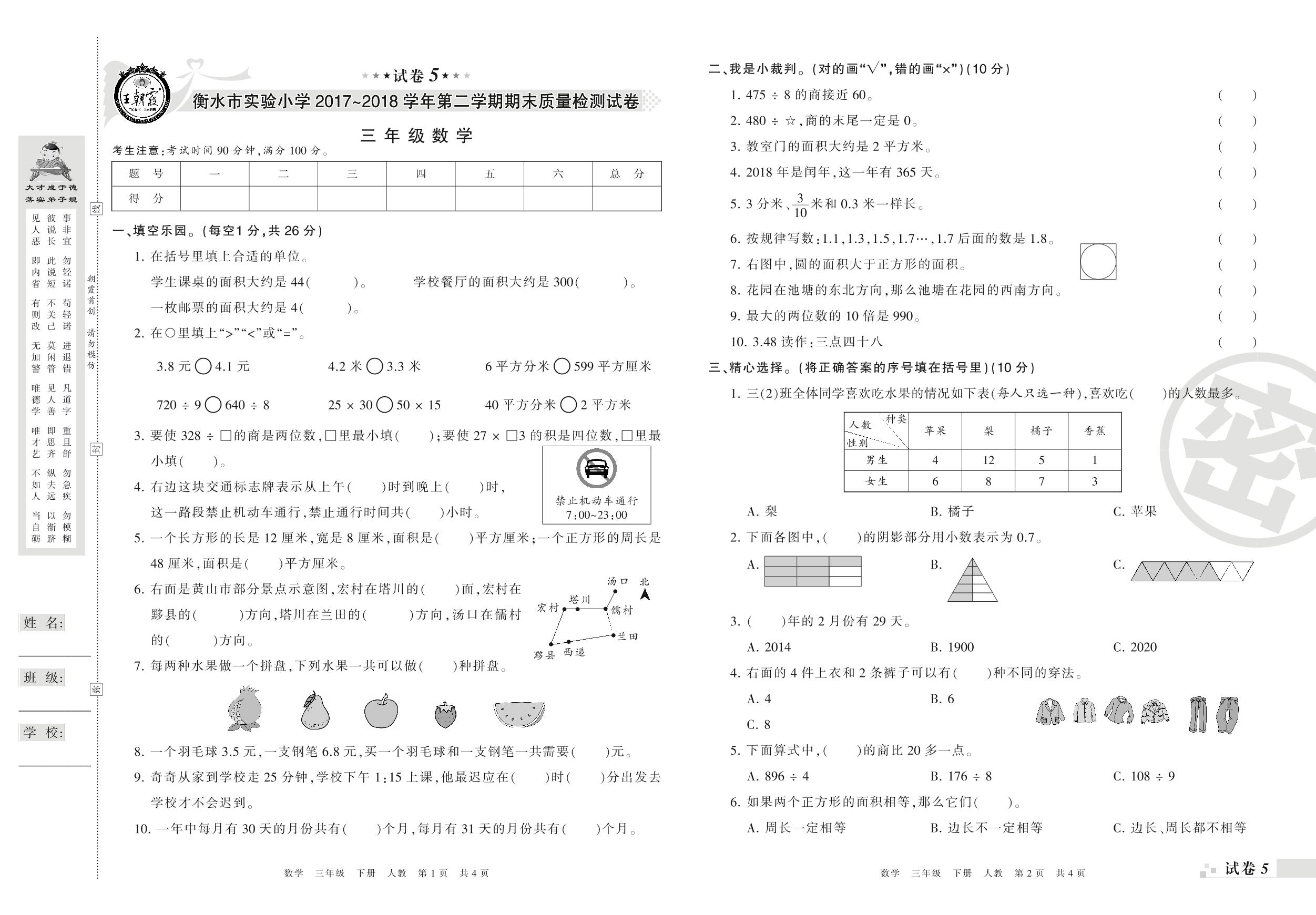 2017-2018学年第二学期衡水市实验小学三年级数学试卷(人教版)【5】