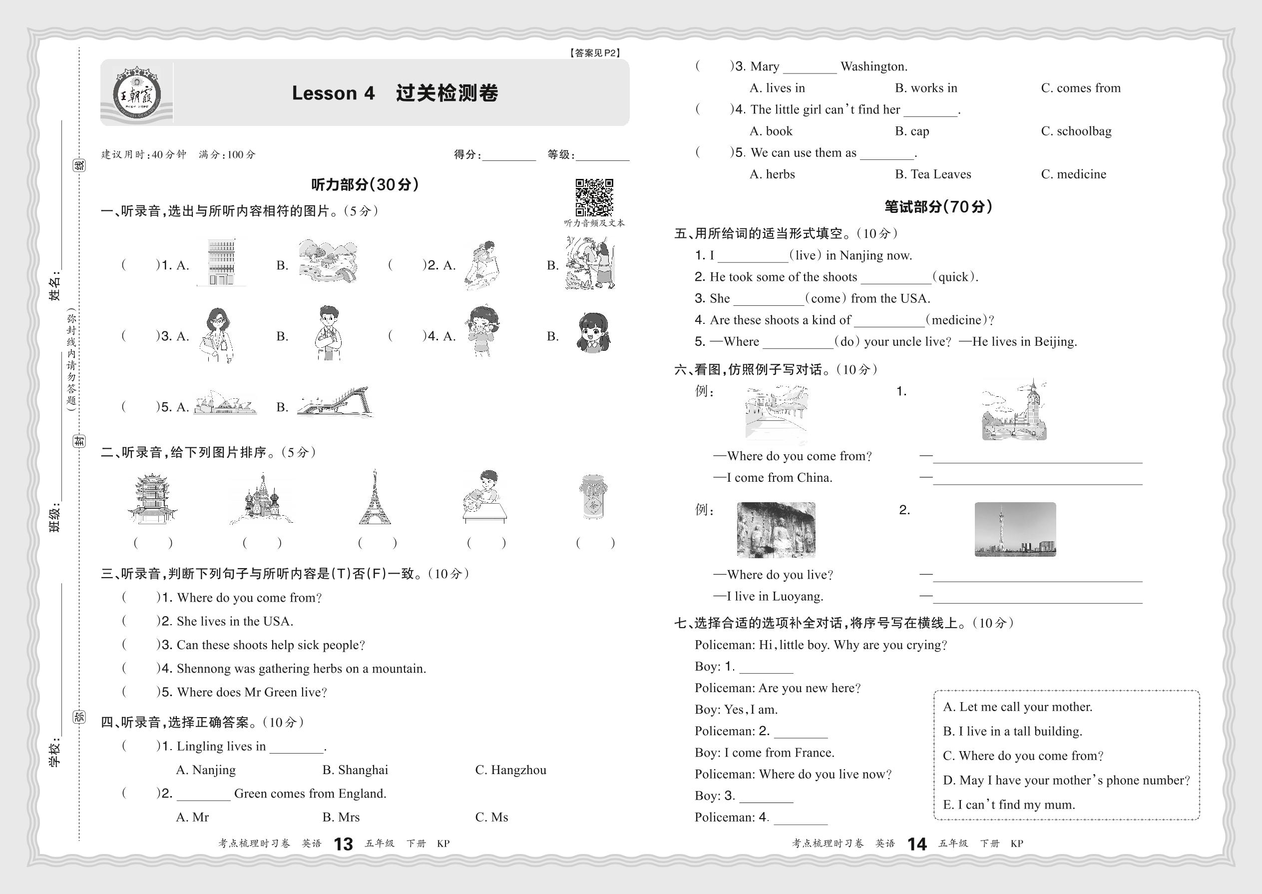 2024春下册五年级英语科普版 Lesson 4 过关检测卷