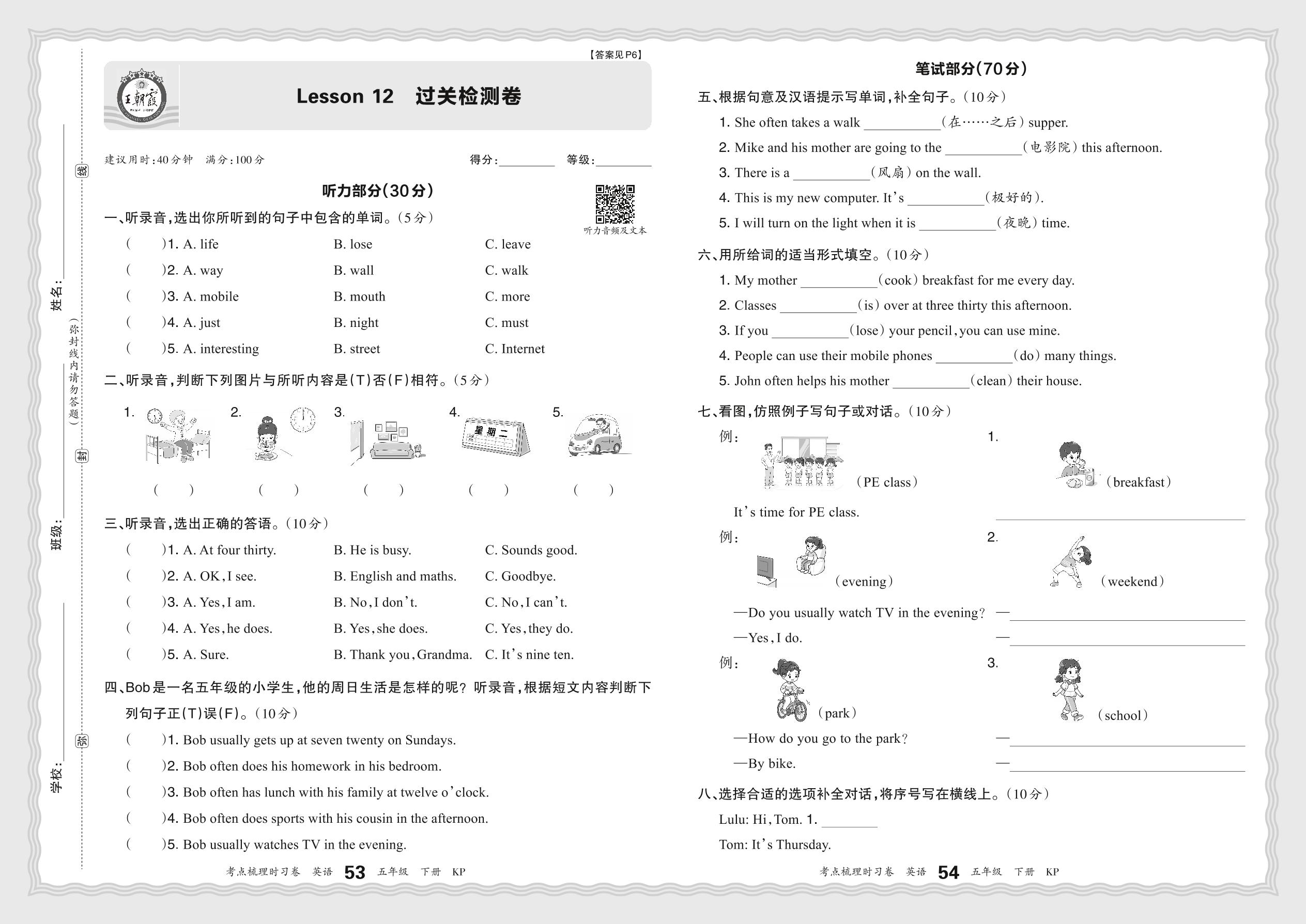 2024春下册五年级英语科普版 Lesson 12 过关检测卷