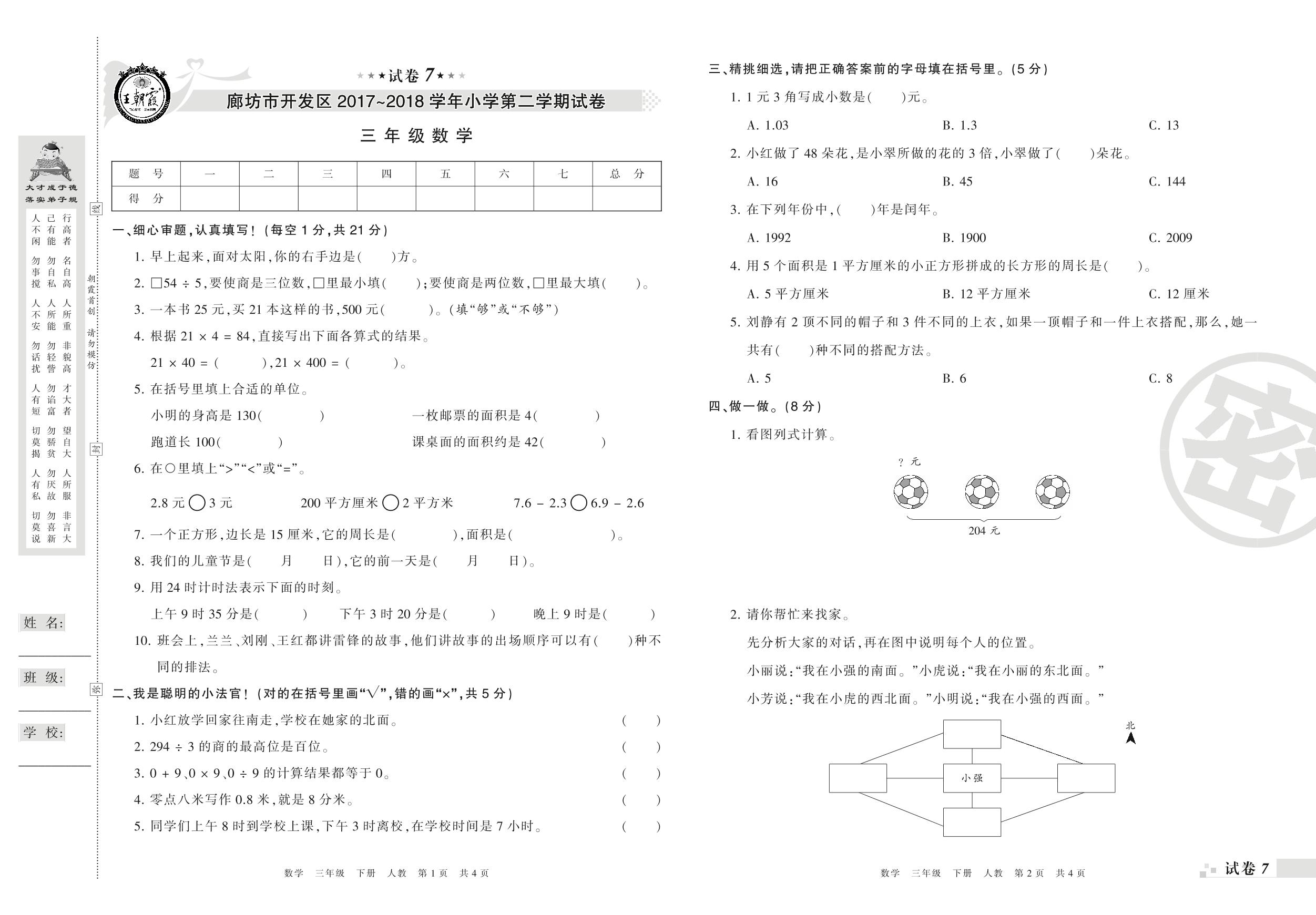 2017-2018学年第二学期廊坊市开发区三年级数学试卷(人教版)【7】