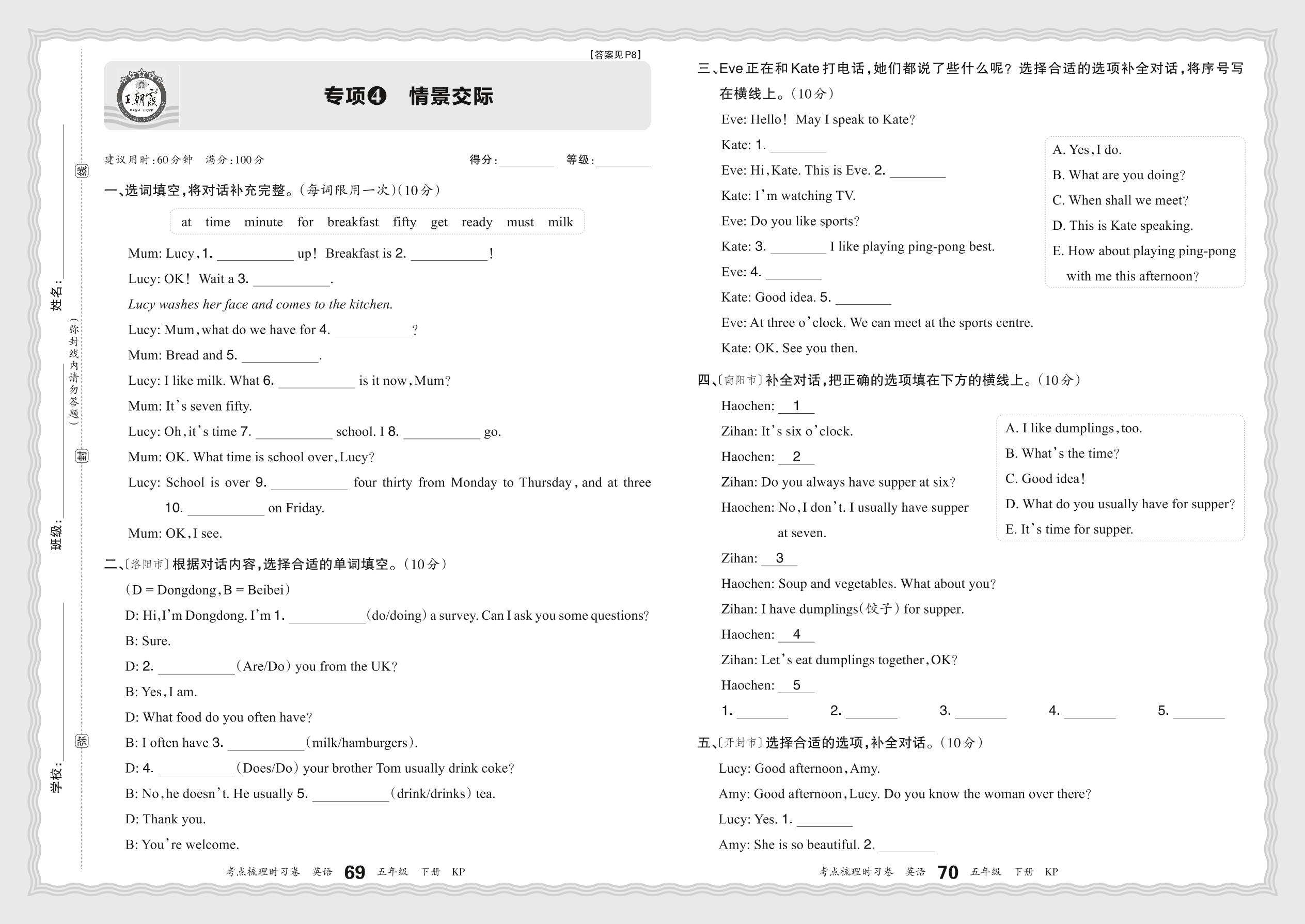 2024春下册五年级英语科普版 期末专项卷KD版·情景交际【4】