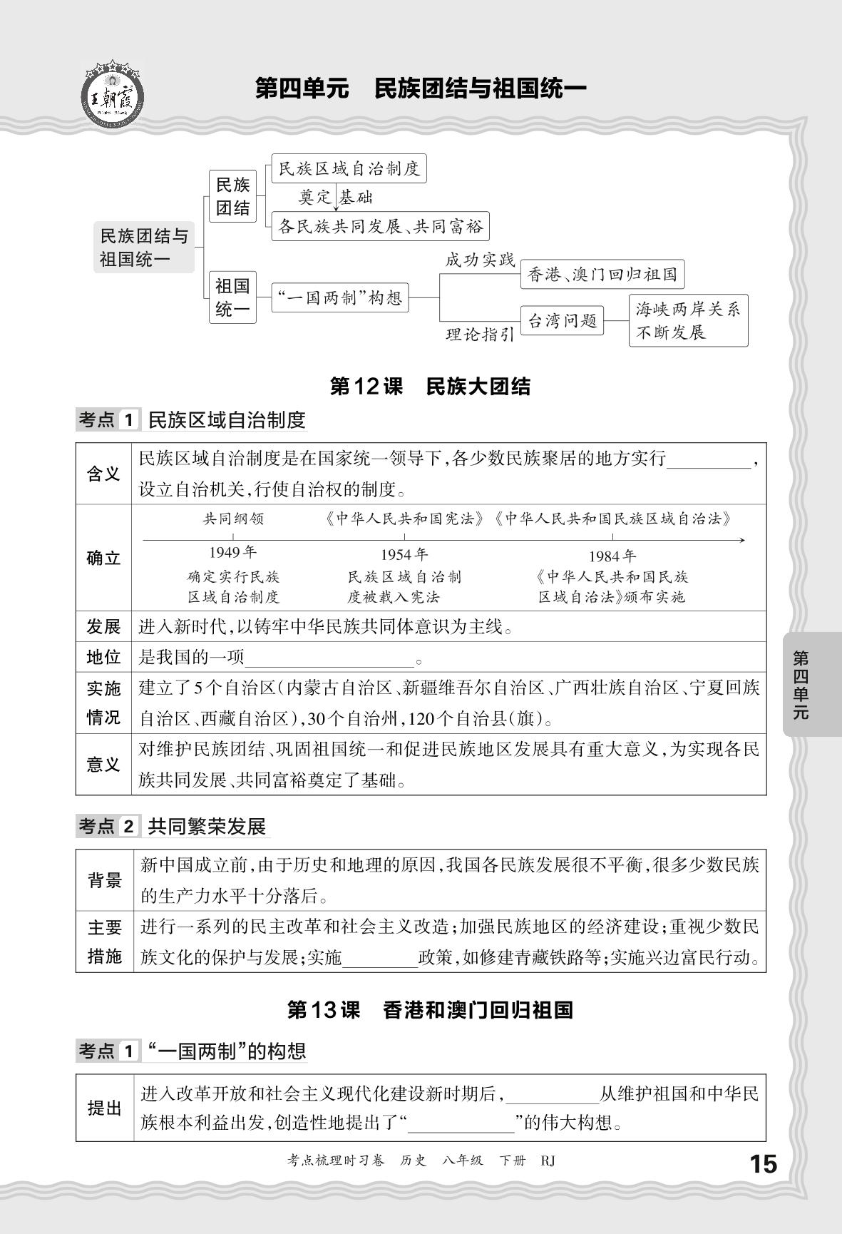 2024春下册八年级历史人教版 考点梳理手册——第四单元 民族团结与祖国统一