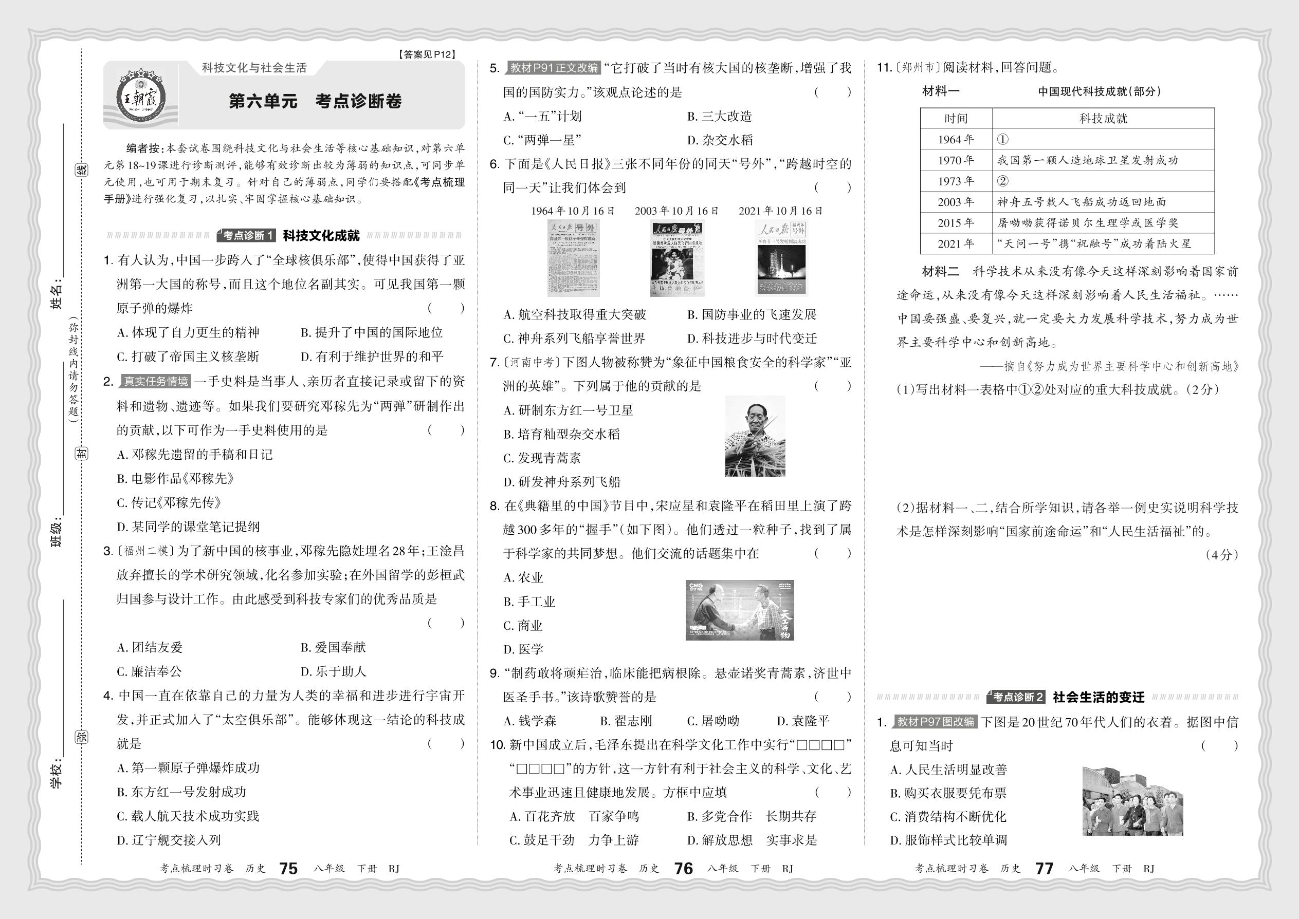 2024春下册八年级历史人教版 第六单元 考点诊断卷