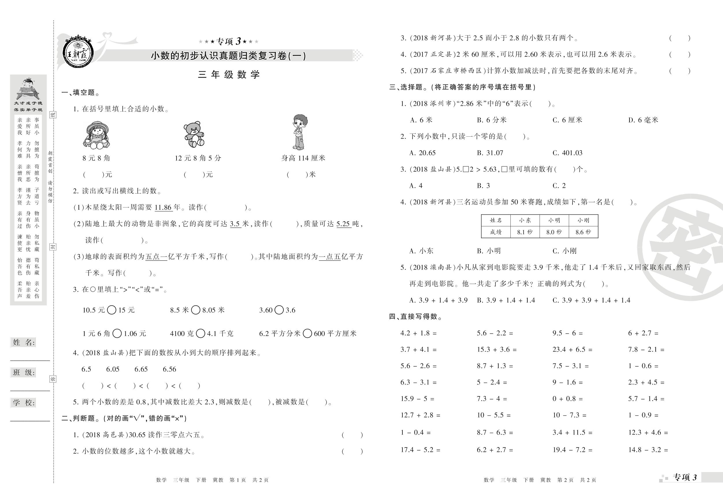 王朝霞期末专项卷——小数的初步认识(一)(二)真题归类复习卷三年级下册数学(冀教版)_R210804100248【0】