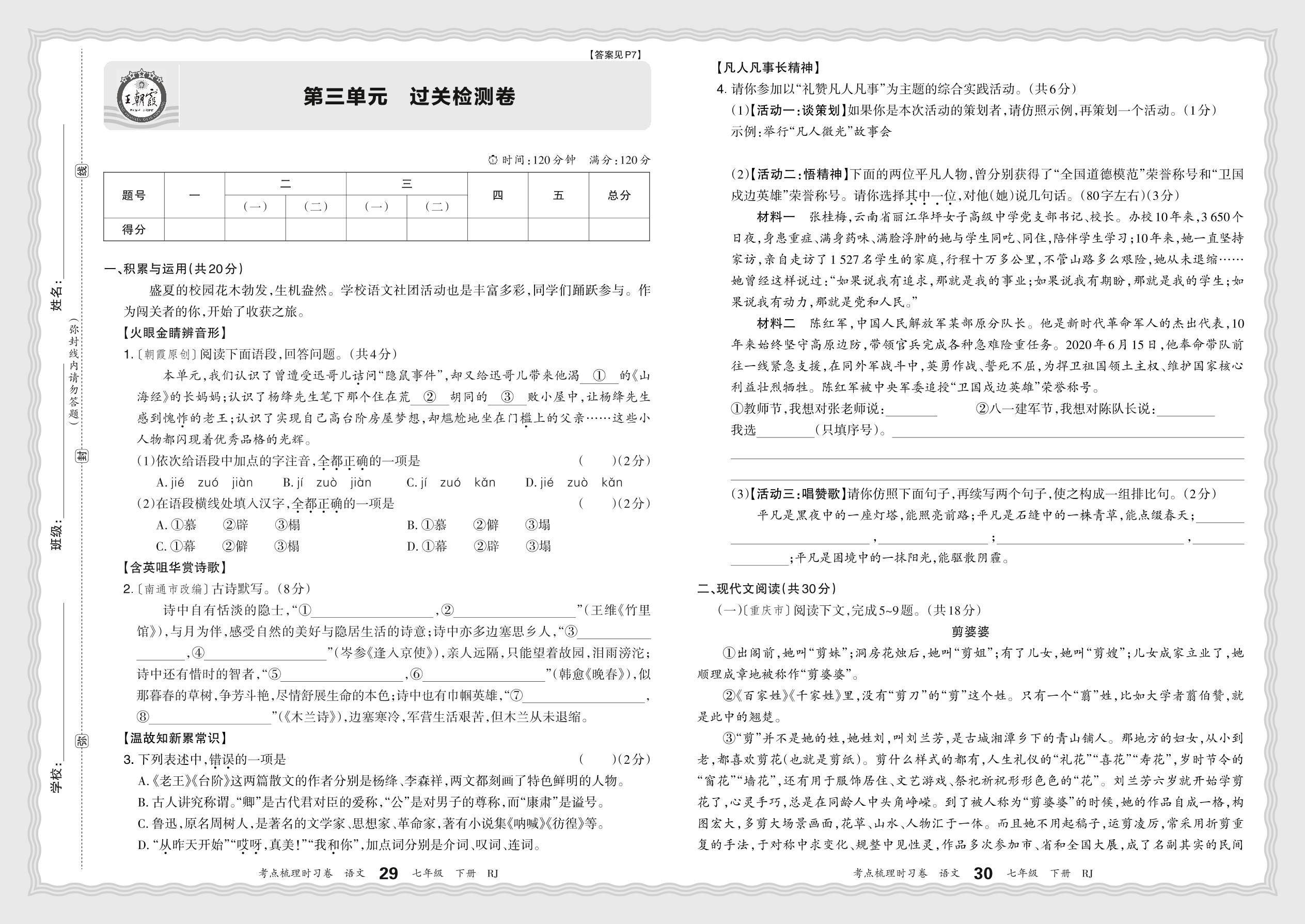 2024春下册七年级语文人教版 第三单元 过关检测卷