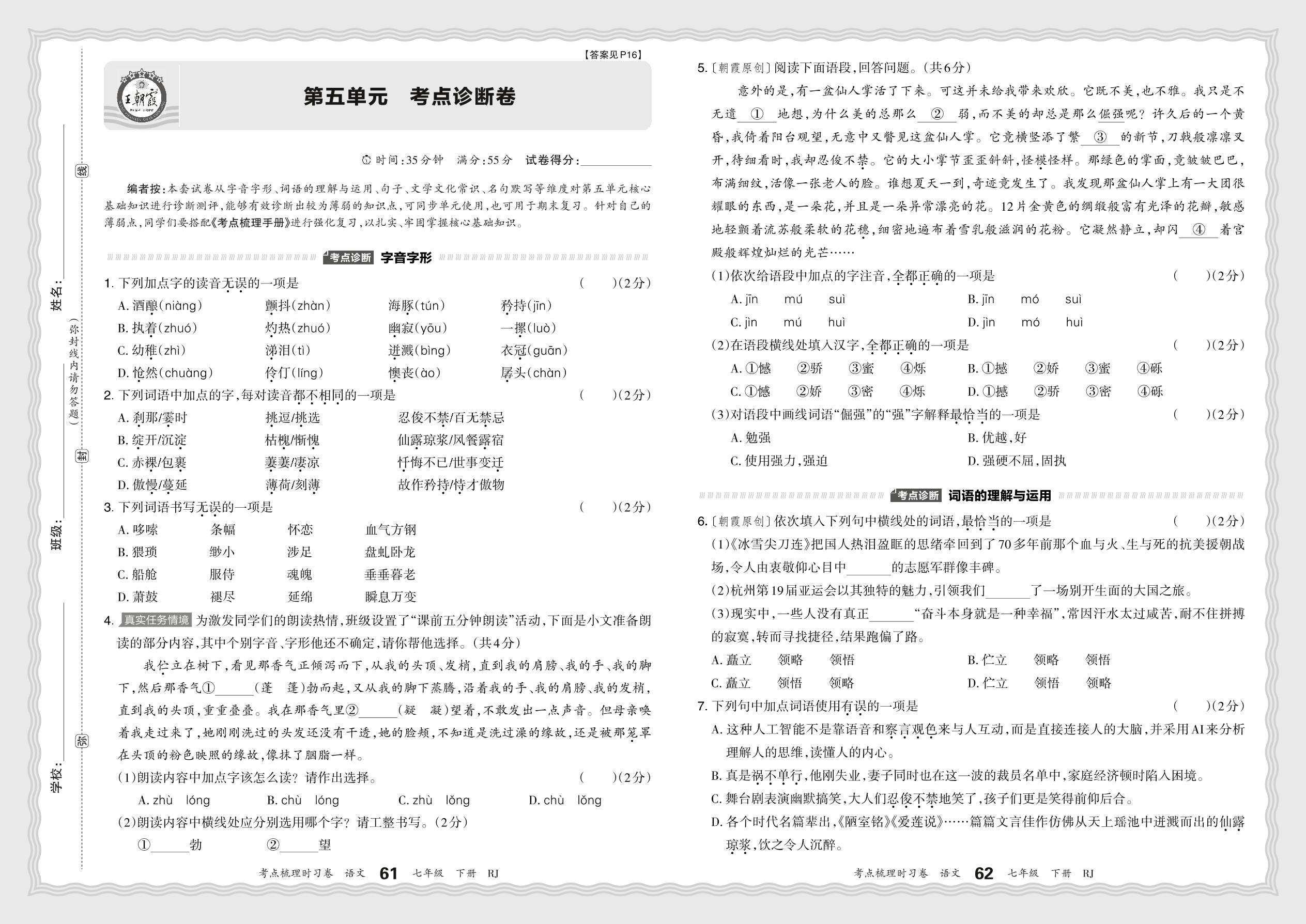2024春下册七年级语文人教版 第五单元 考点诊断卷