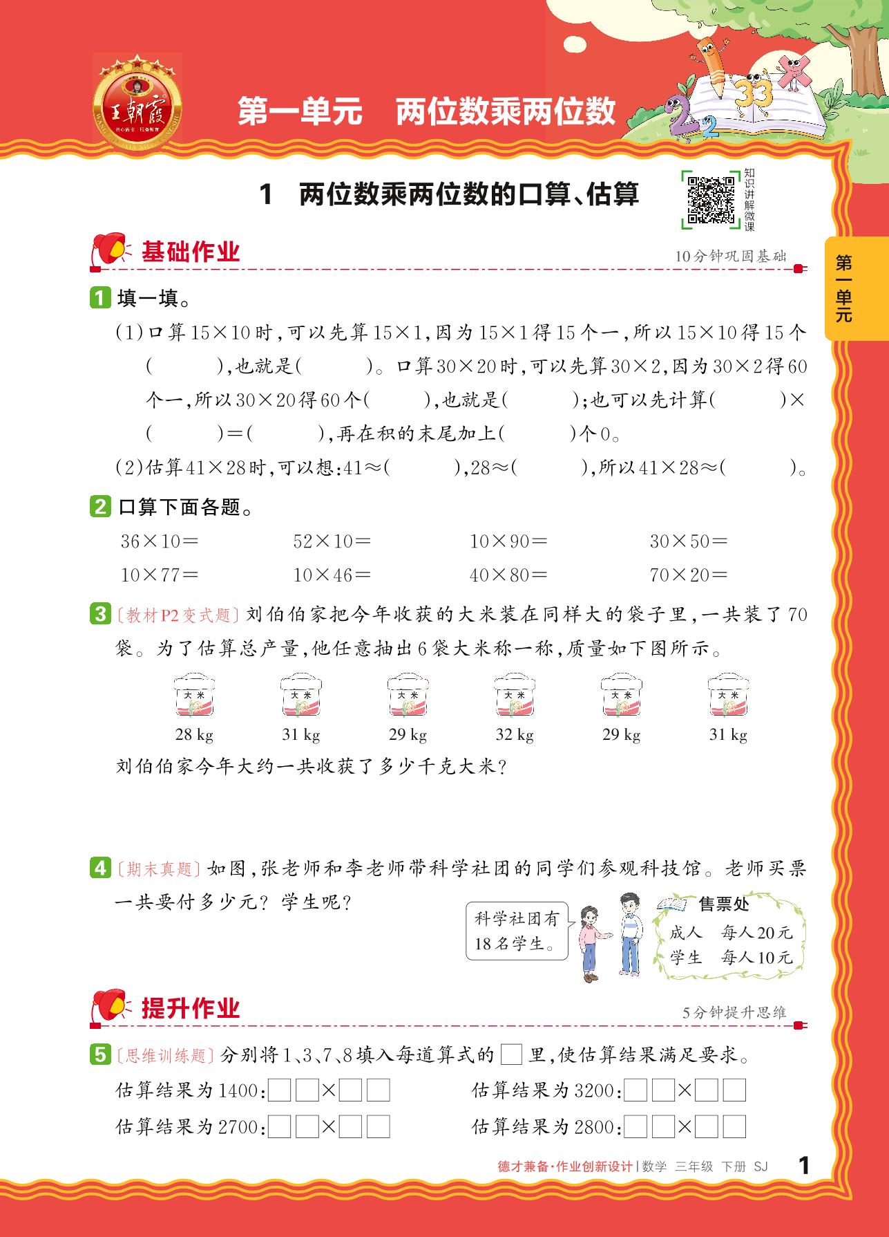 2024春下册三年级数学苏教版 第一单元 两位数乘两位数——1. 两位数乘两位数的口算、估算