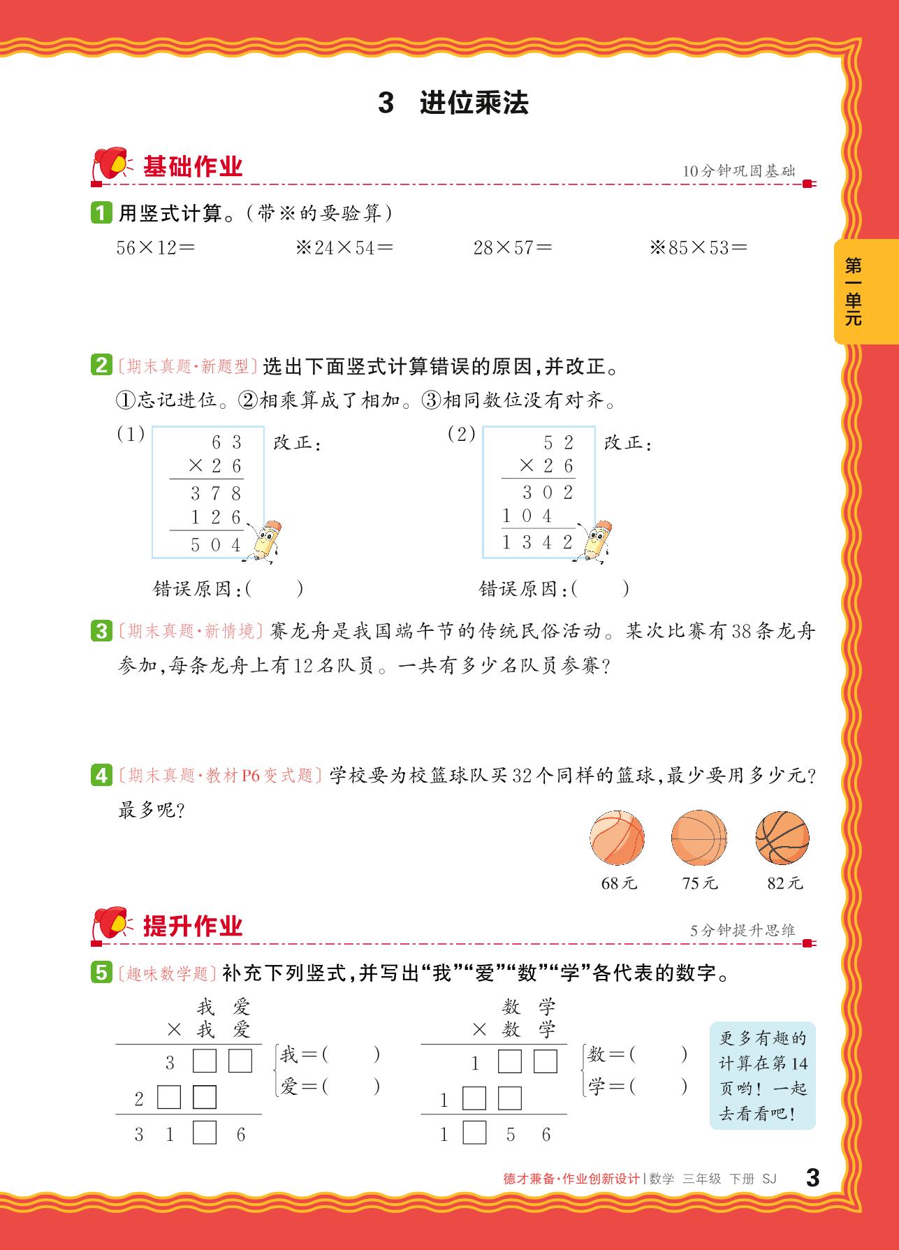 2024春下册三年级数学苏教版 第一单元 两位数乘两位数——3. 进位乘法