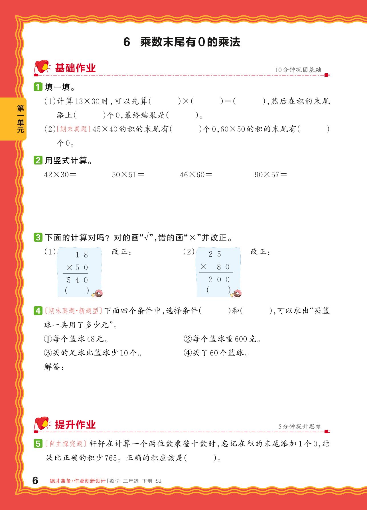 2024春下册三年级数学苏教版 第一单元 两位数乘两位数——6. 乘数末尾有0的乘法