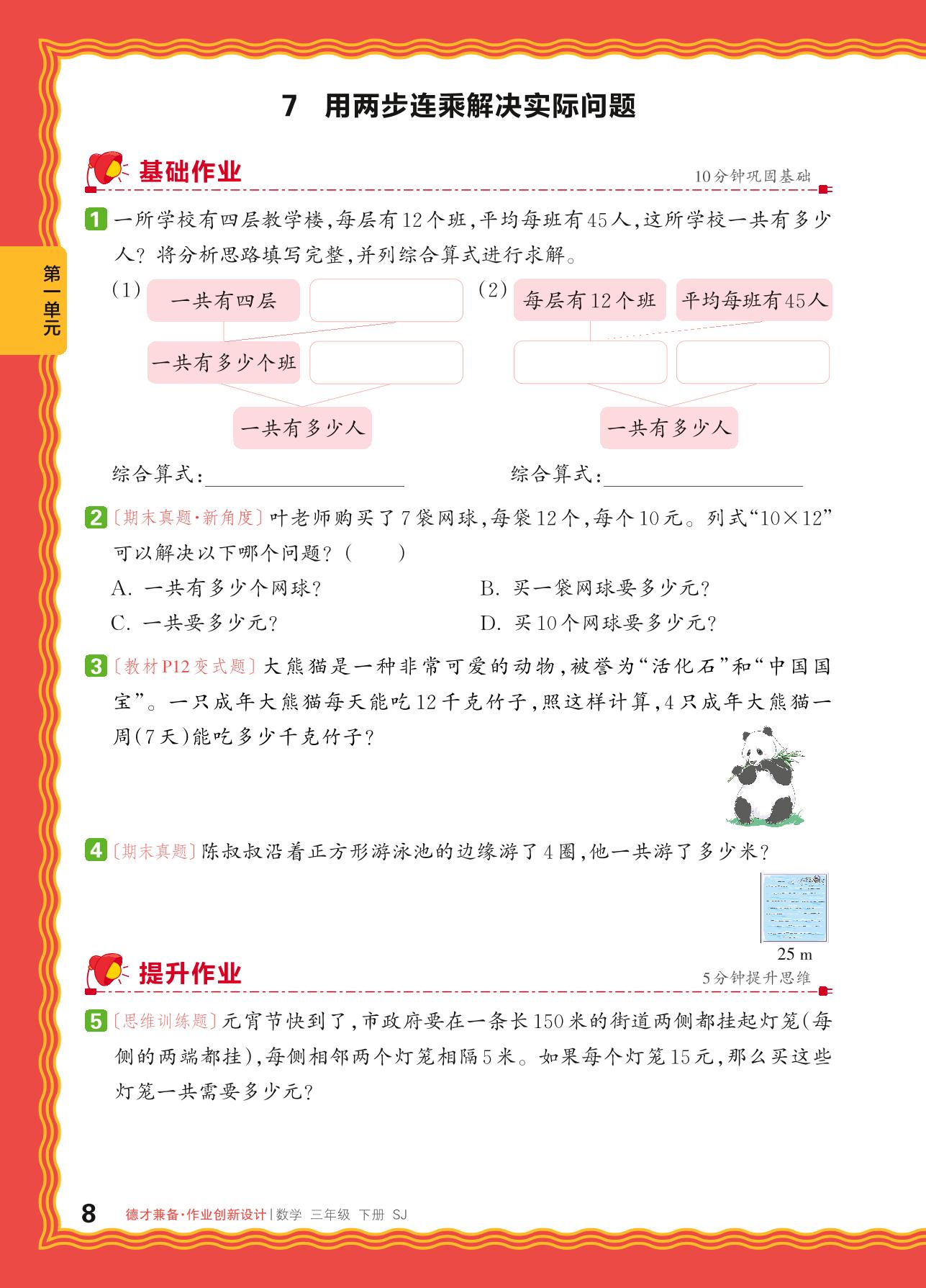 2024春下册三年级数学苏教版 第一单元 两位数乘两位数——7. 用两步连乘解决实际问题
