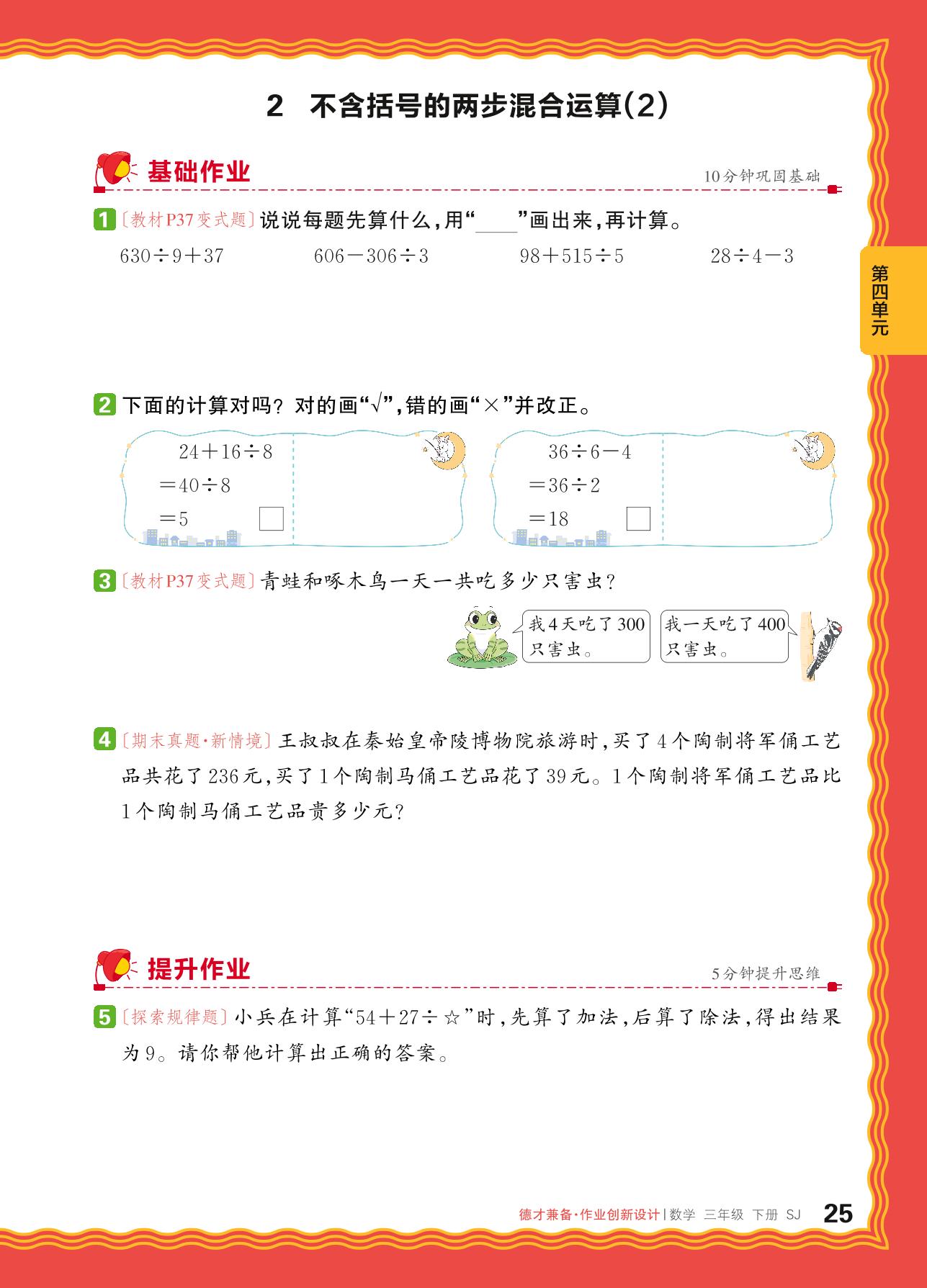 2024春下册三年级数学苏教版 第四单元 混合运算——2. 不含括号的两步混合运算(2)
