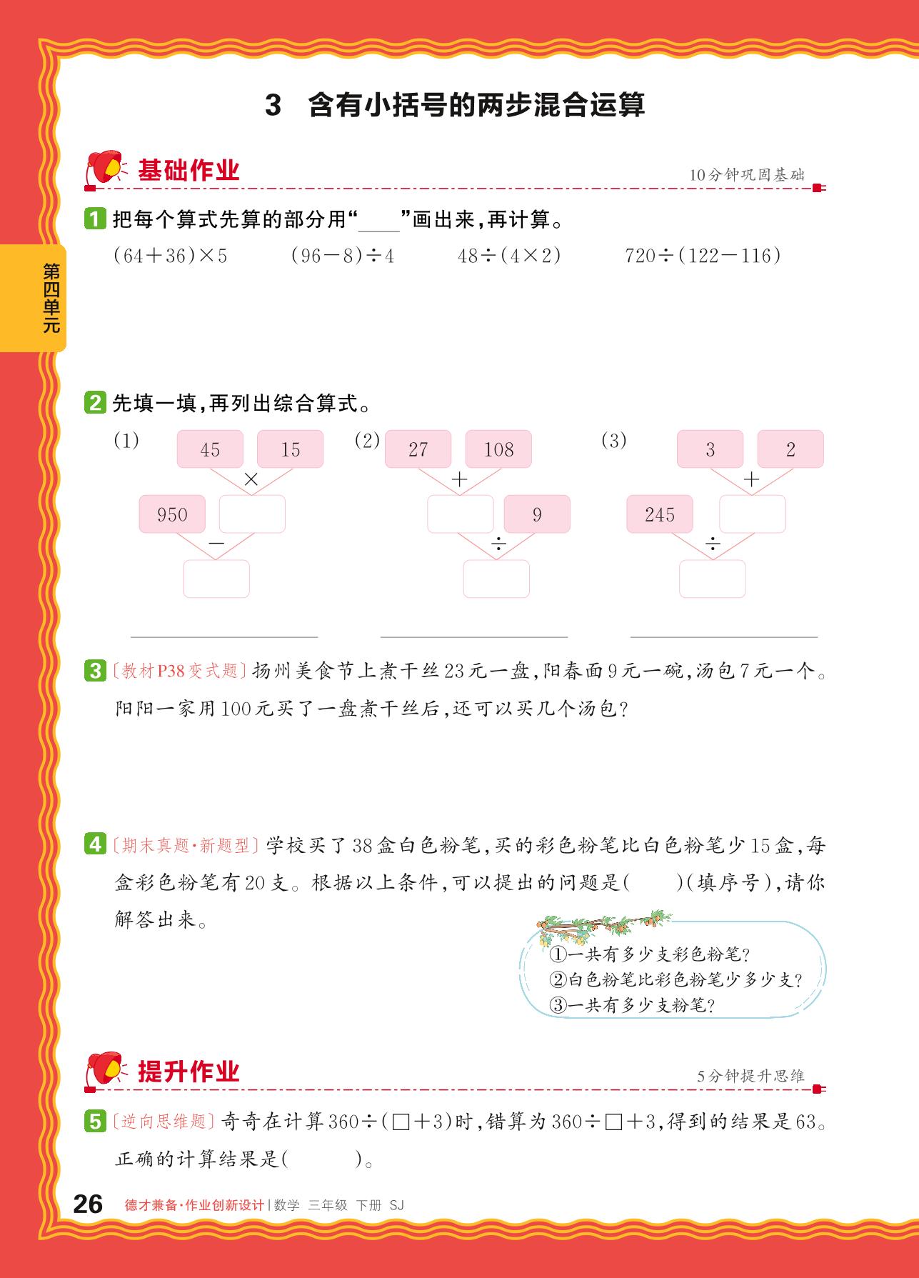 2024春下册三年级数学苏教版 第四单元 混合运算——3. 含有小括号的两步混合运算