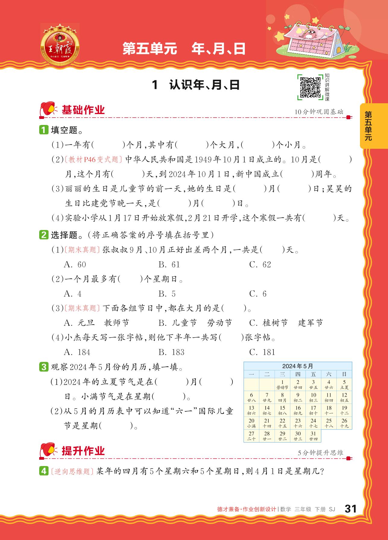 2024春下册三年级数学苏教版 第五单元 年、月、日——1. 认识年、月、日