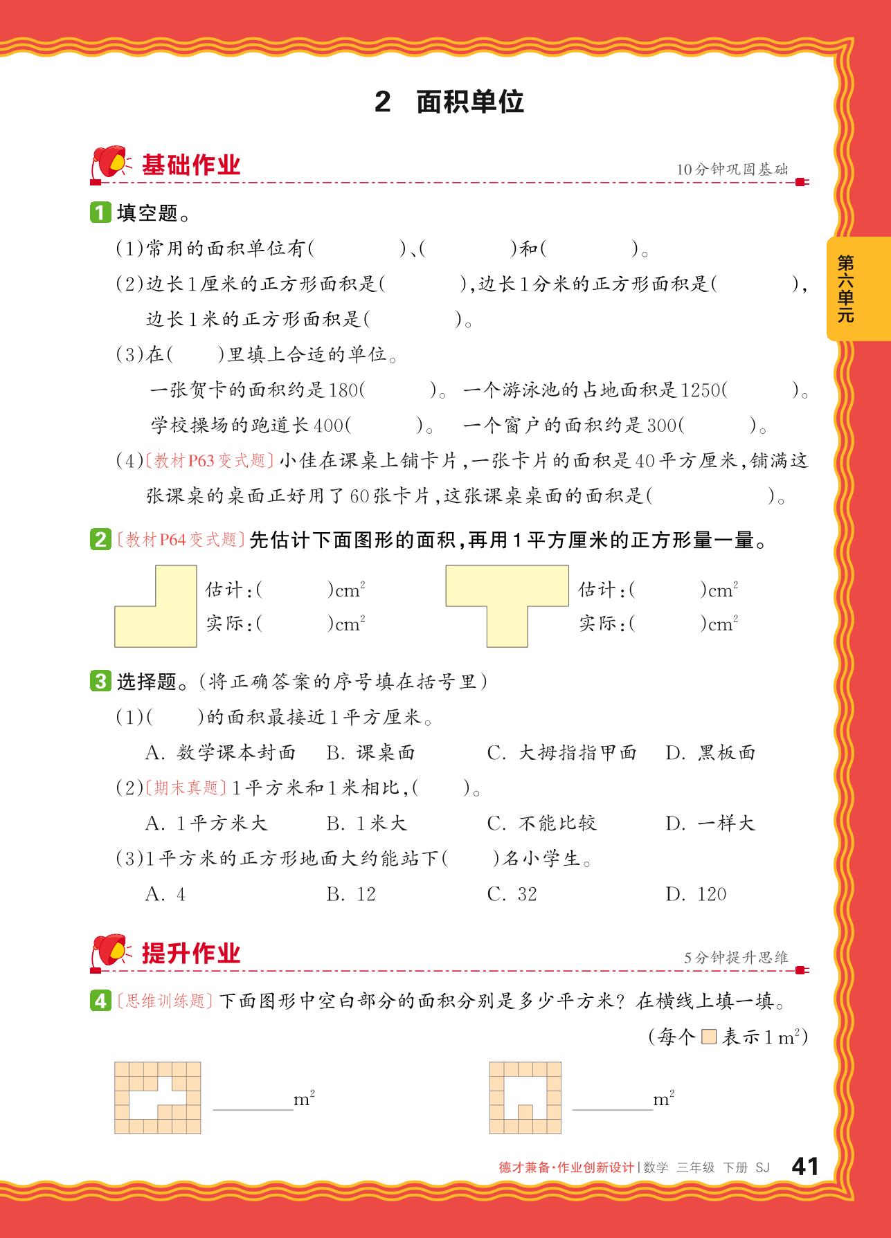 2024春下册三年级数学苏教版 第六单元 长方形和正方形的面积——2. 面积单位