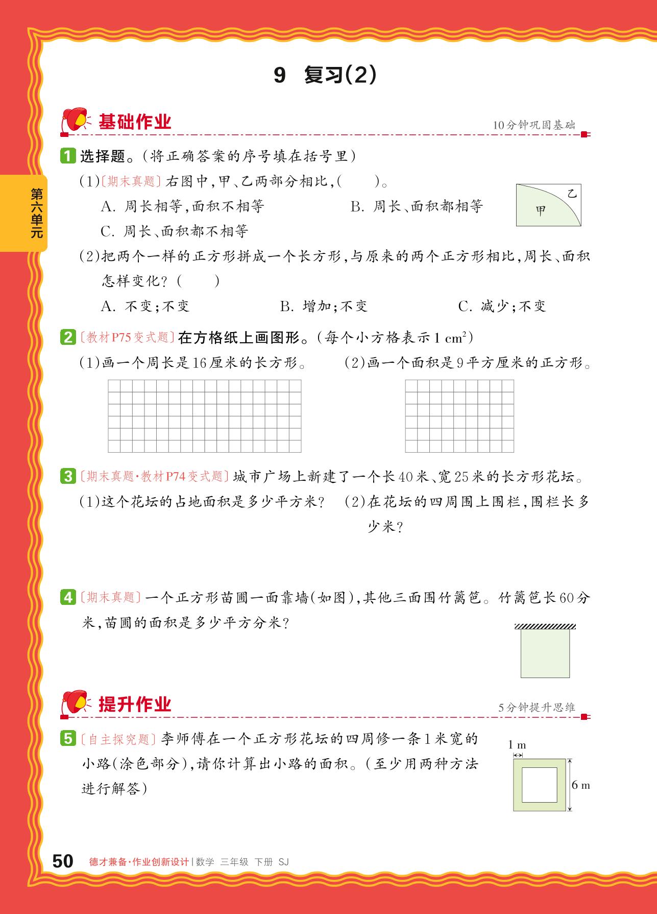 2024春下册三年级数学苏教版 第六单元 长方形和正方形的面积——9. 复习(2)