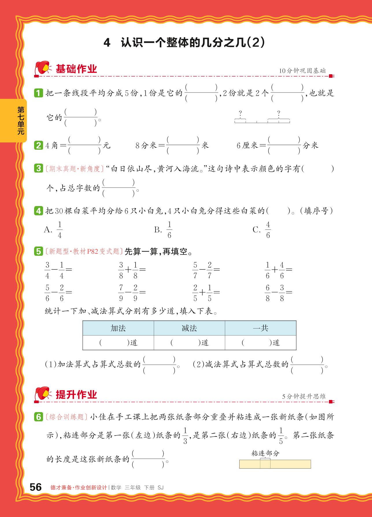 2024春下册三年级数学苏教版 第七单元 分数的初步认识(二)——4. 认识一个整体的几分之几(2)