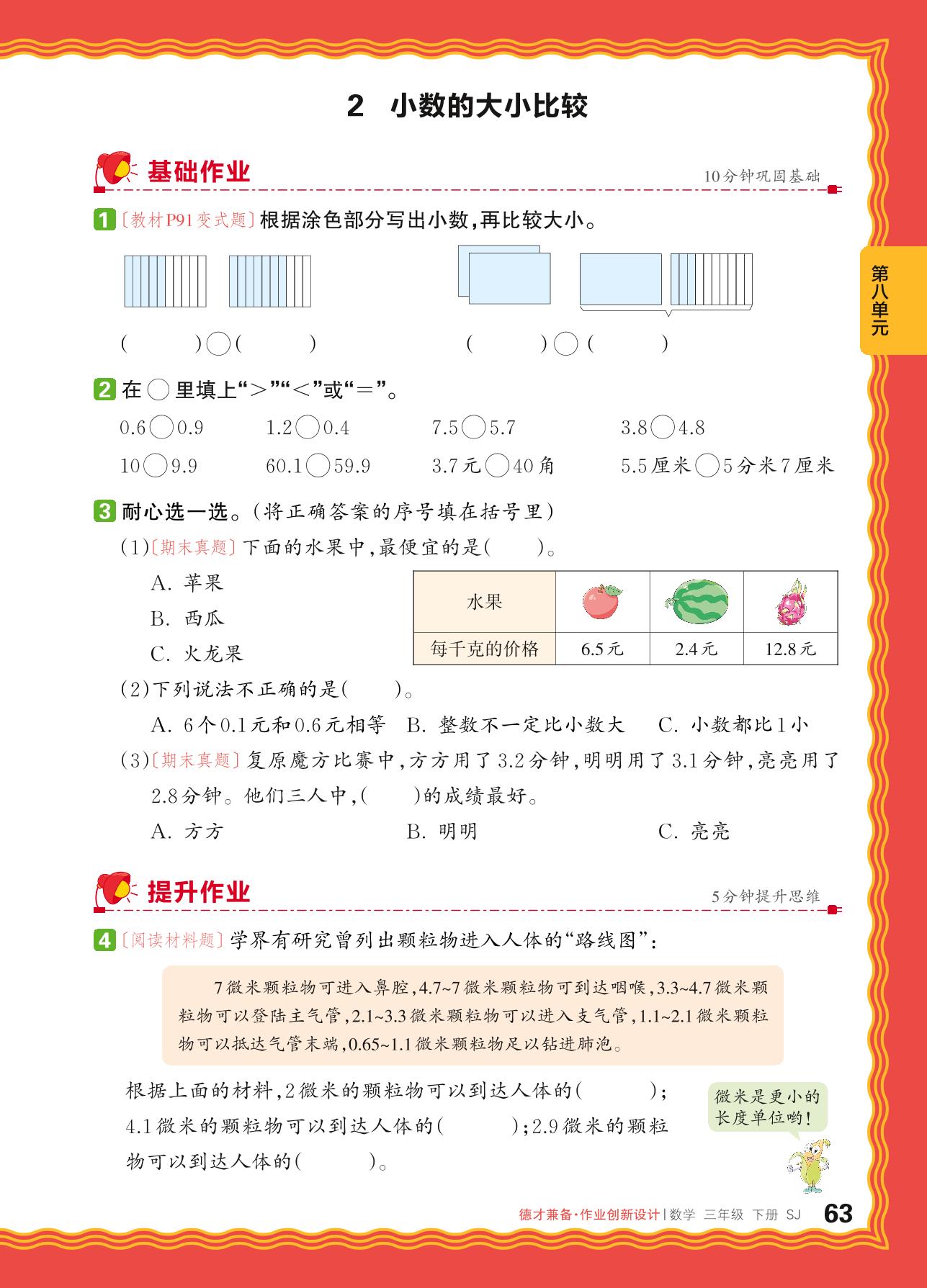 2024春下册三年级数学苏教版 第八单元 小数的初步认识——2. 小数的大小比较