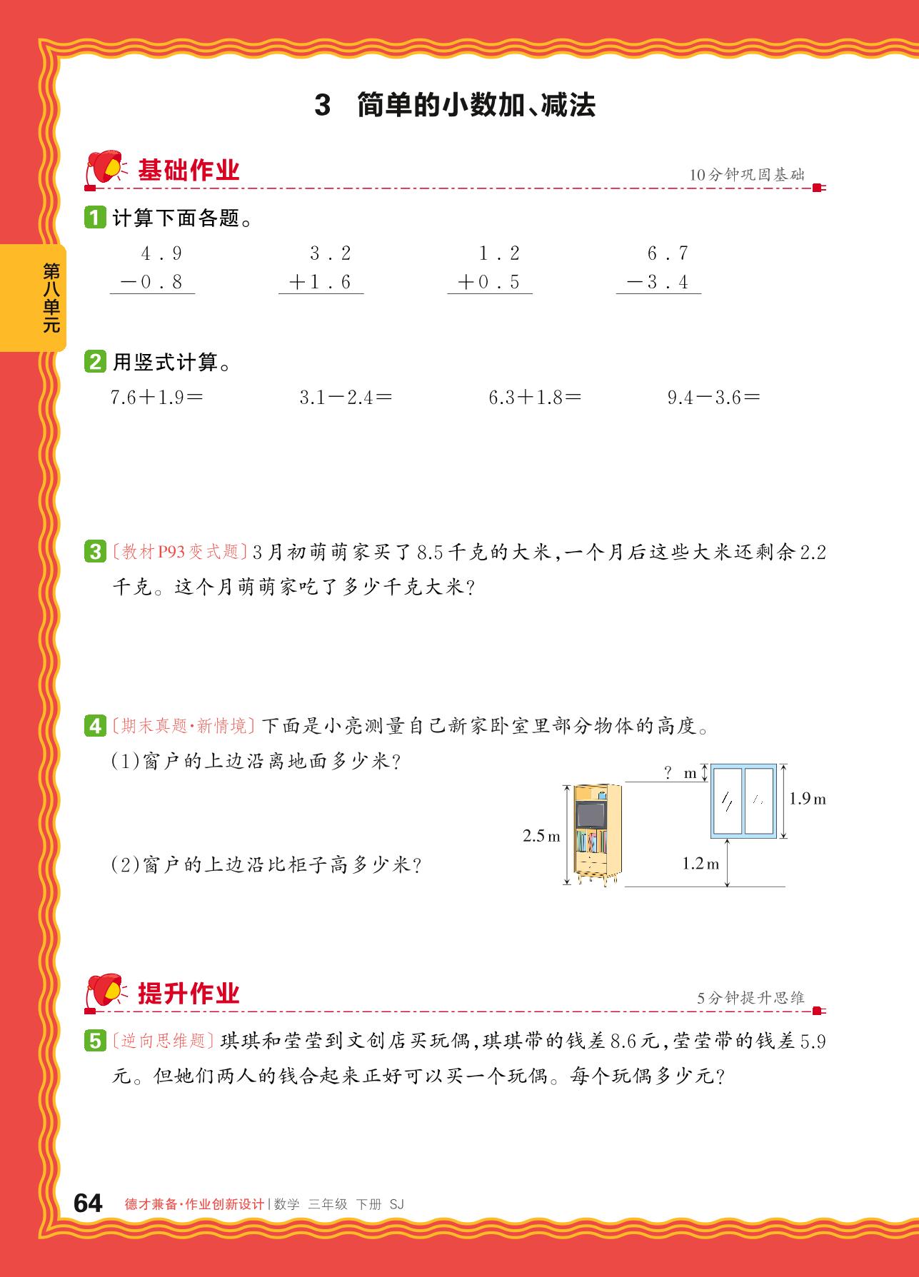 2024春下册三年级数学苏教版 第八单元 小数的初步认识——3. 简单的小数加、减法
