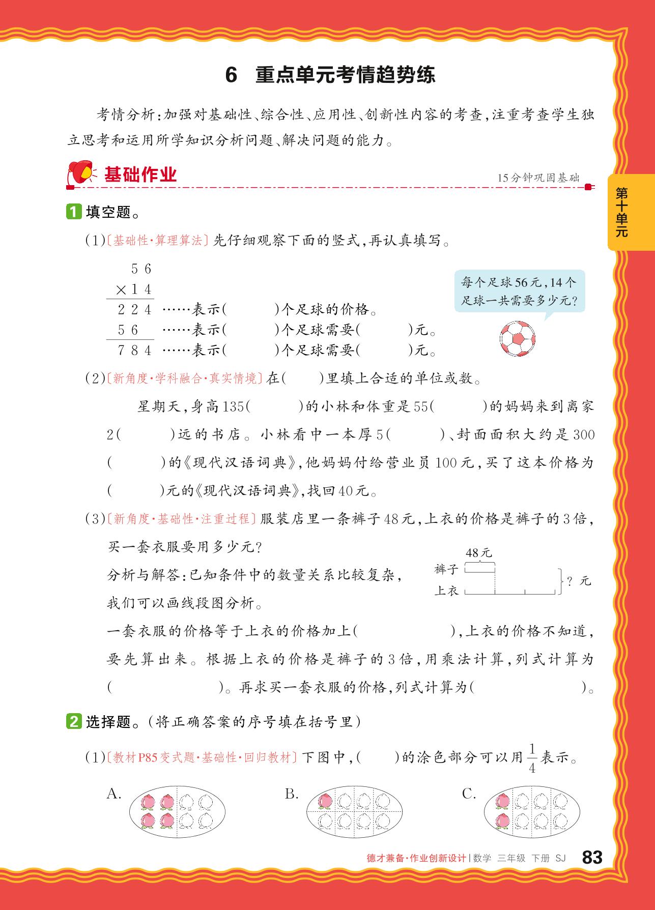 2024春下册三年级数学苏教版 第十单元 期末复习——6. 重点单元考情趋势练