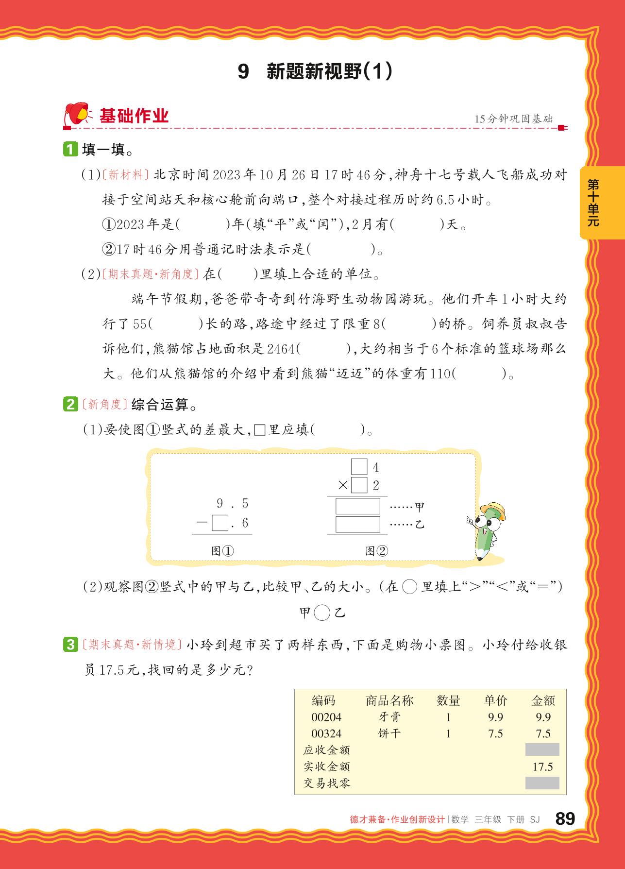 2024春下册三年级数学苏教版 第十单元 期末复习——9. 新题新视野(1)