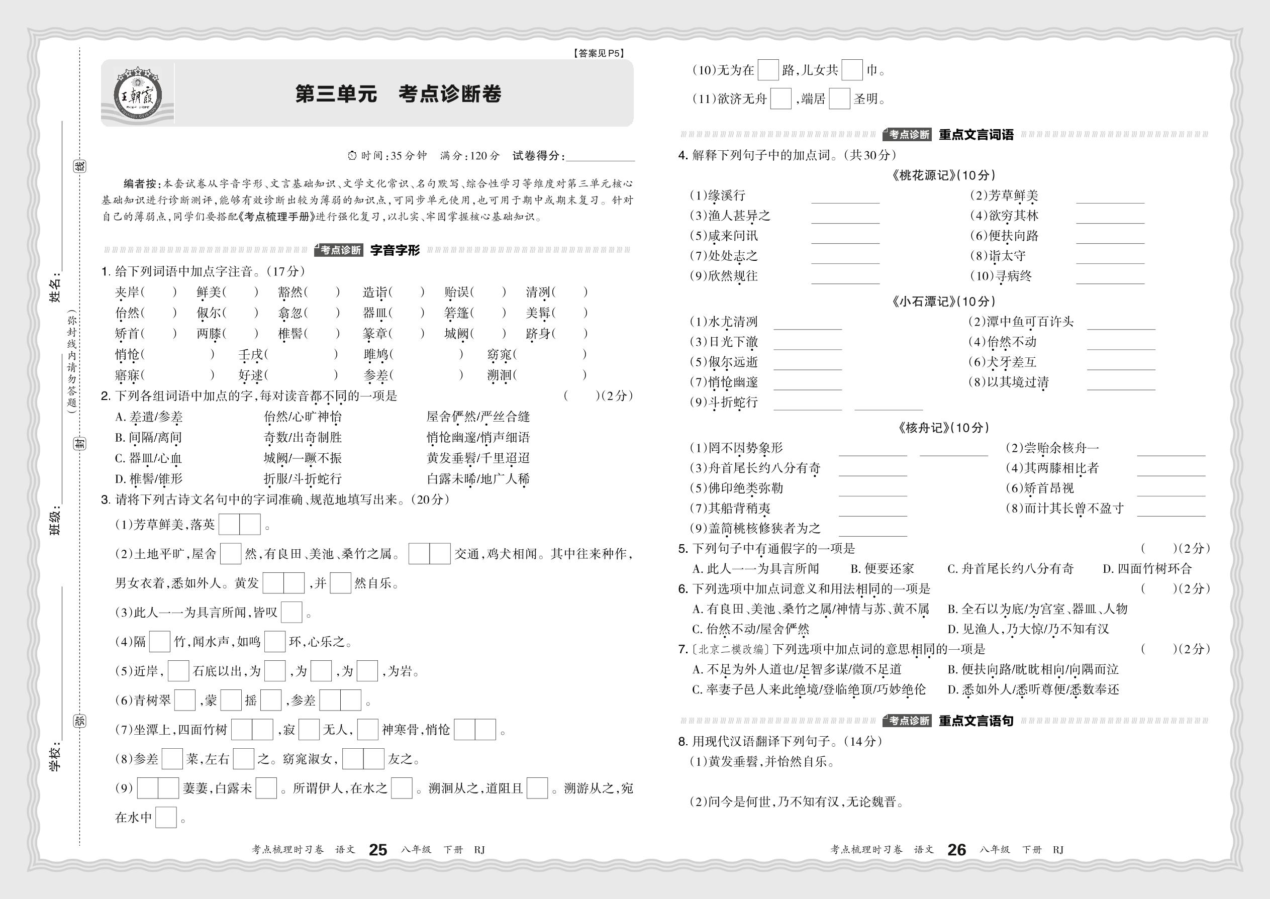 2024春下册八年级语文人教版 第三单元 考点诊断卷