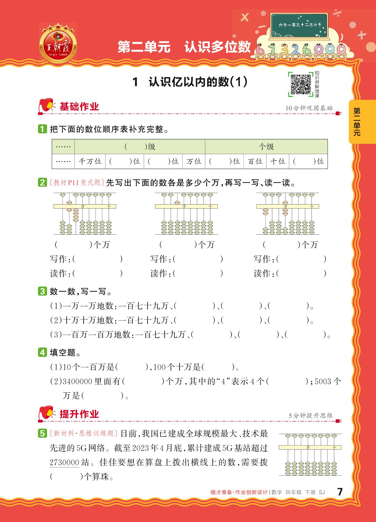 2024春下册四年级数学苏教版 第二单元 认识多位数——1. 认识亿以内的数(1)
