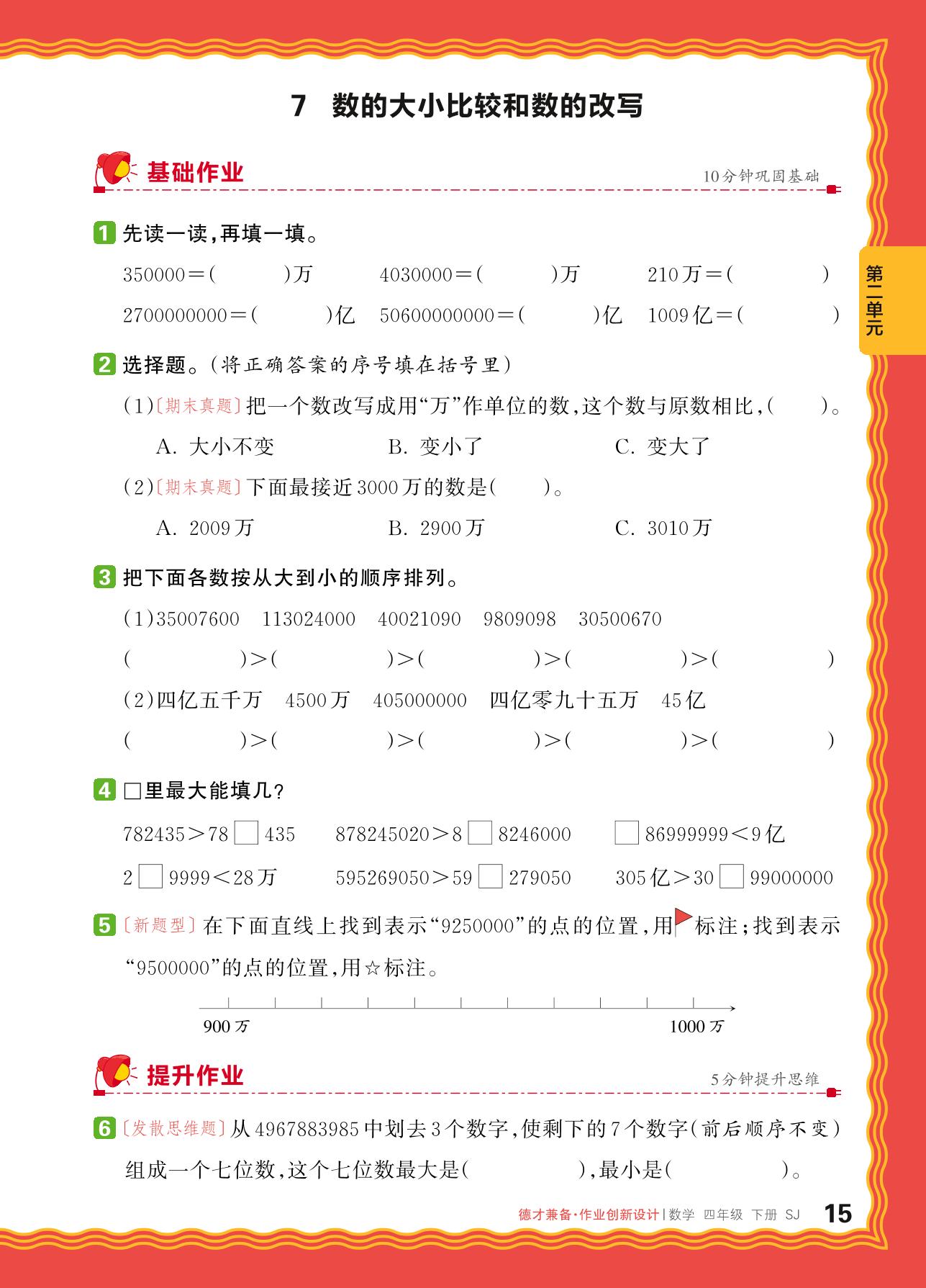 2024春下册四年级数学苏教版 第二单元 认识多位数——7. 数的大小比较和数的改写