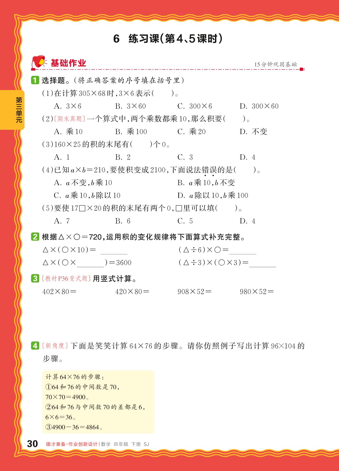 2024春下册四年级数学苏教版 第三单元 三位数乘两位数——积的变化规律、乘数末尾有0的乘法的简便计算练习课_R