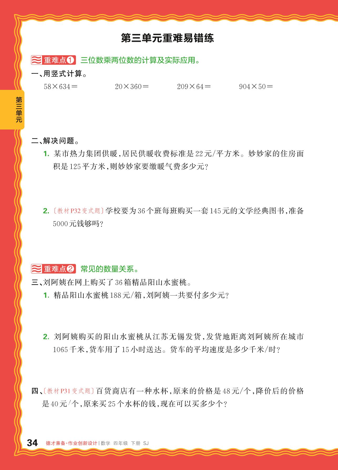 2024春下册四年级数学苏教版 第三单元重难易错练