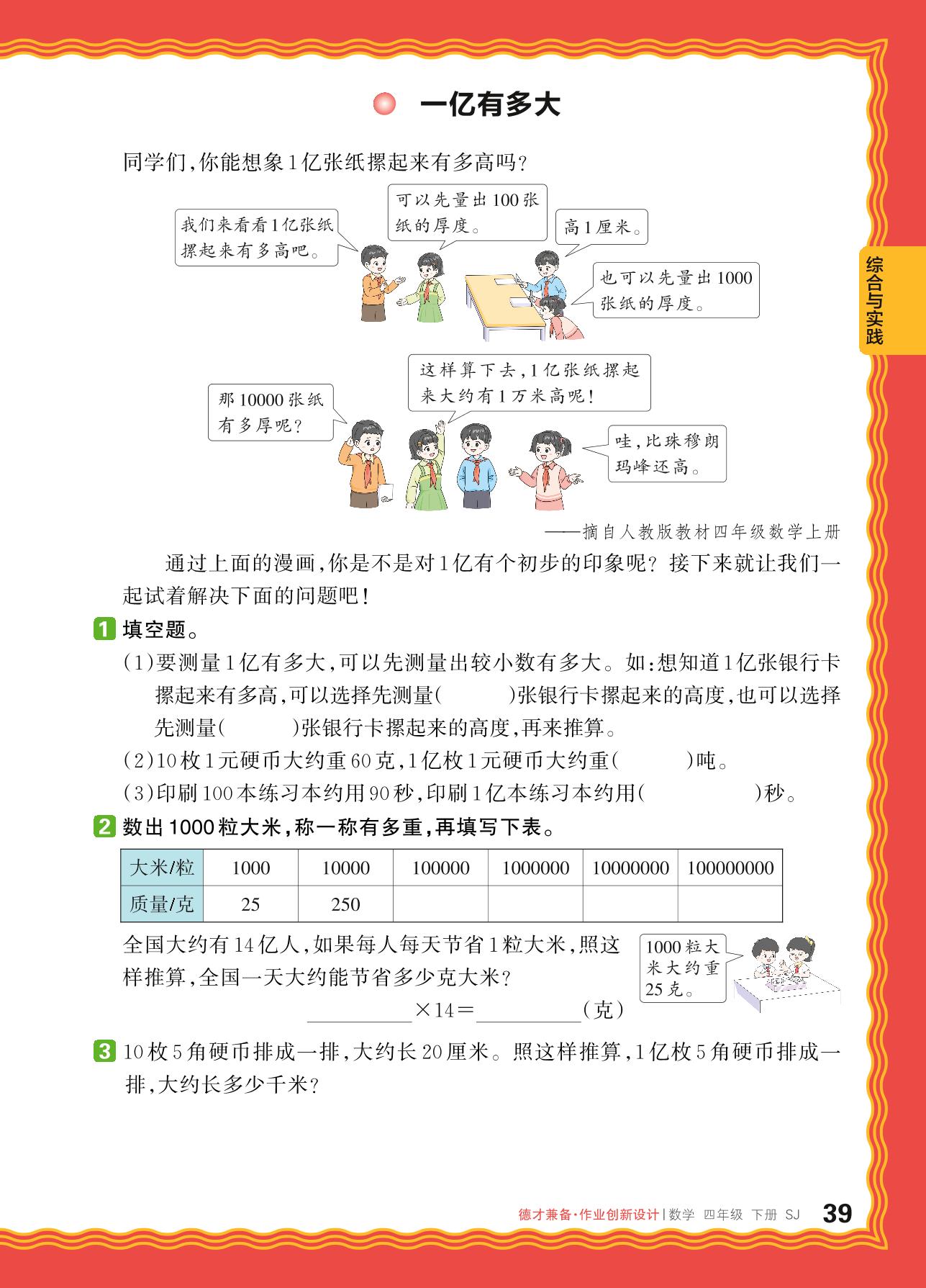 2024春下册四年级数学苏教版 综合与实践——一亿有多大