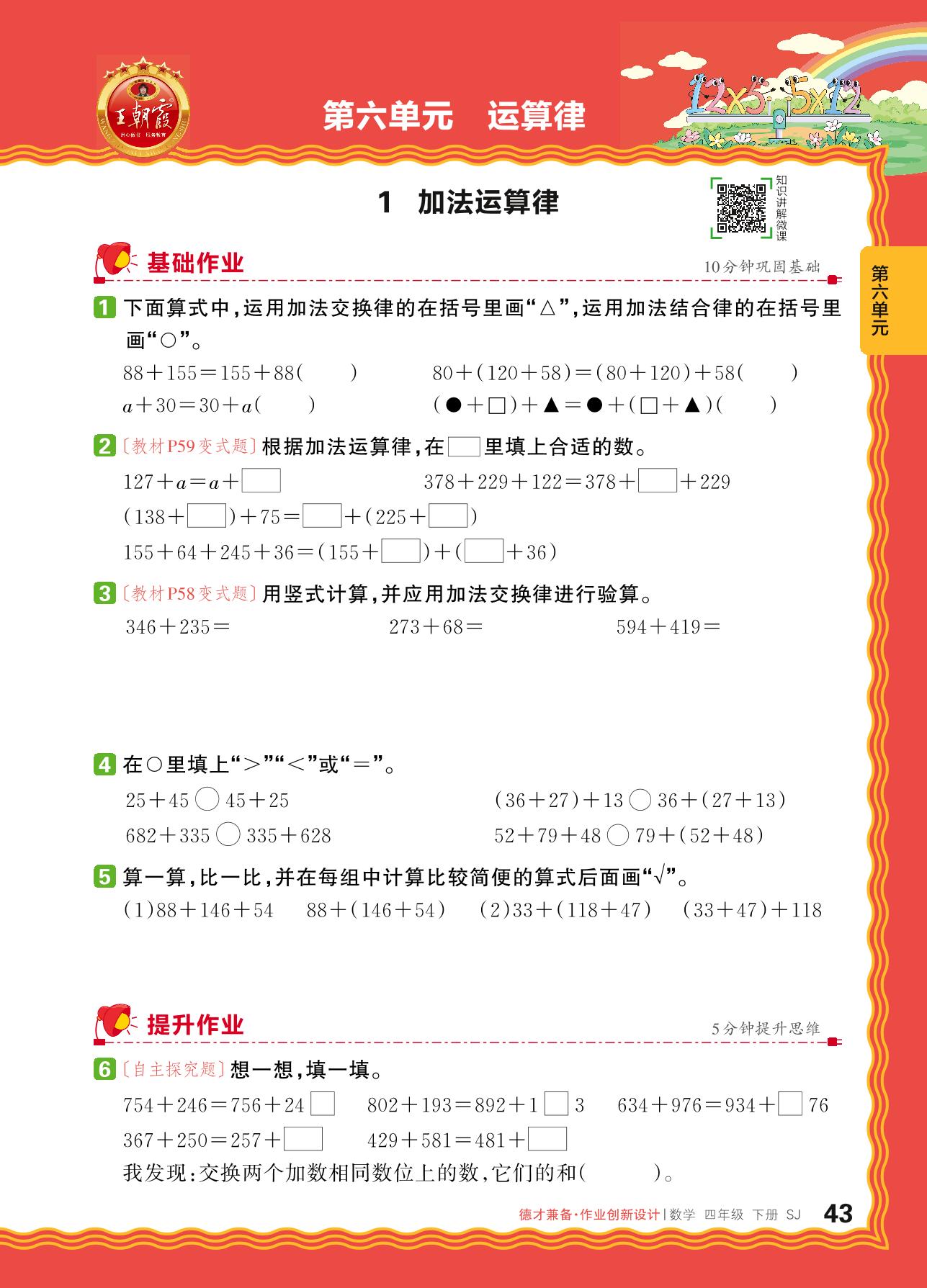 2024春下册四年级数学苏教版 第六单元 运算律——1. 加法运算律
