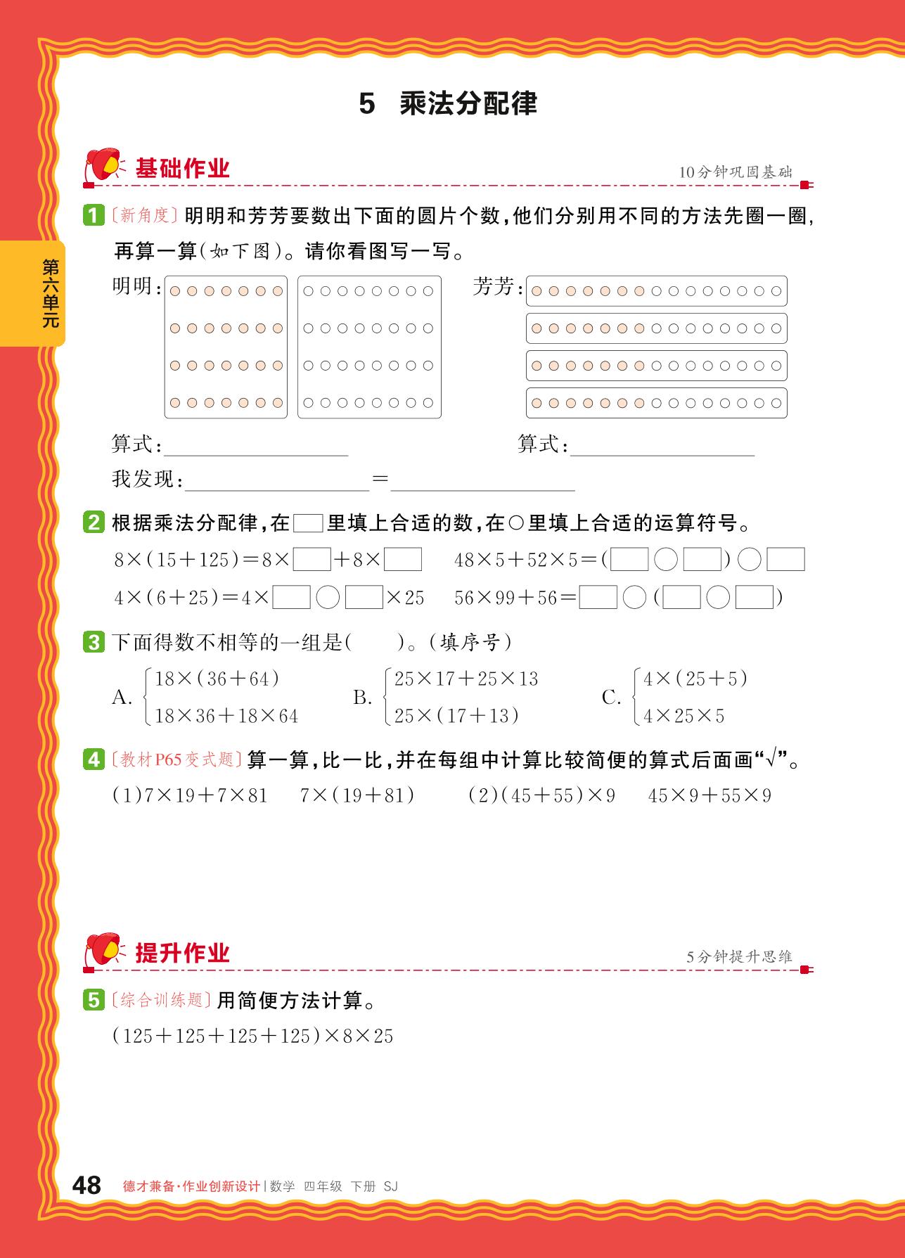 2024春下册四年级数学苏教版 第六单元 运算律——5. 乘法分配律