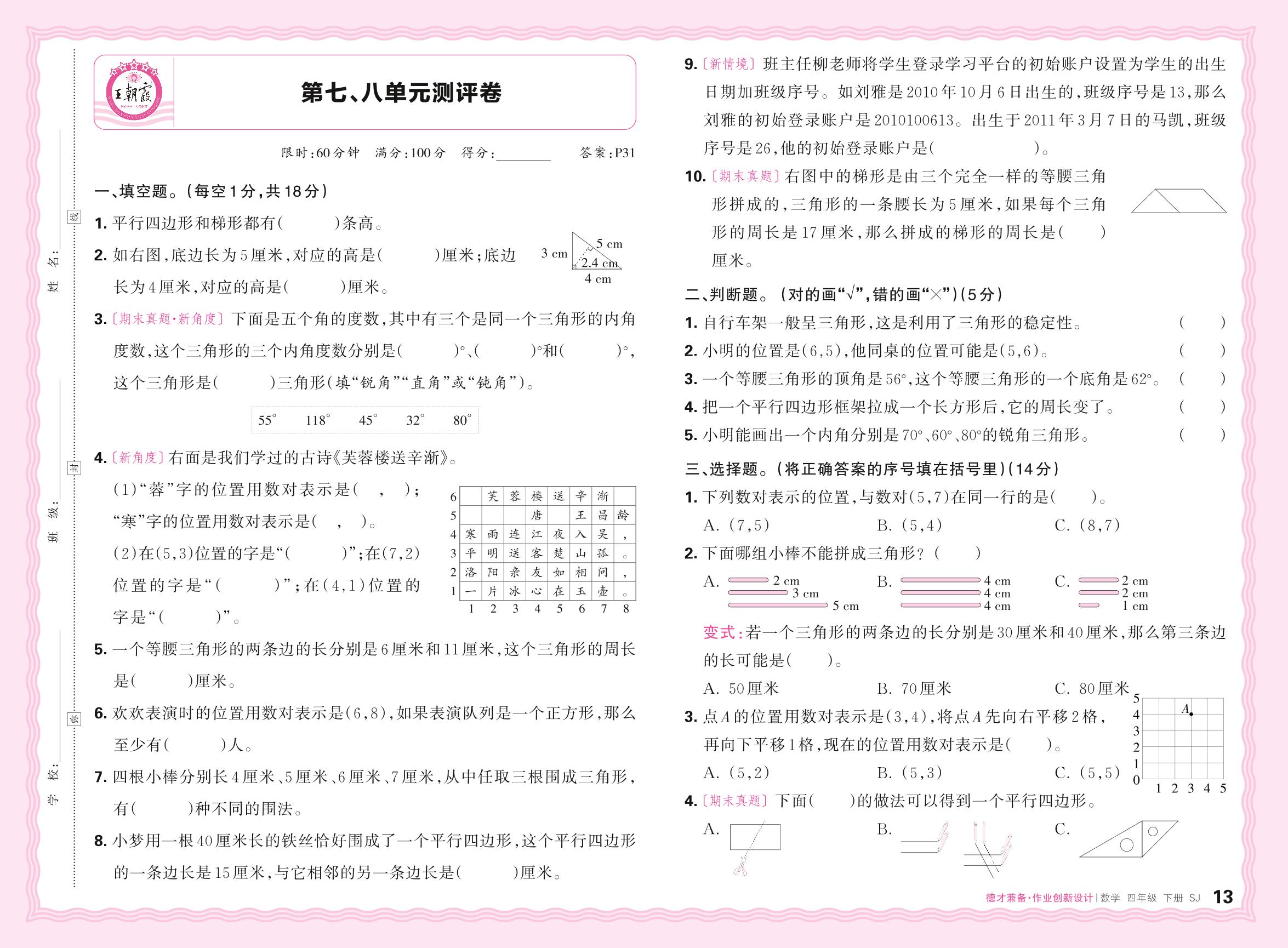 2024春下册四年级数学苏教版 第七、八单元测评卷