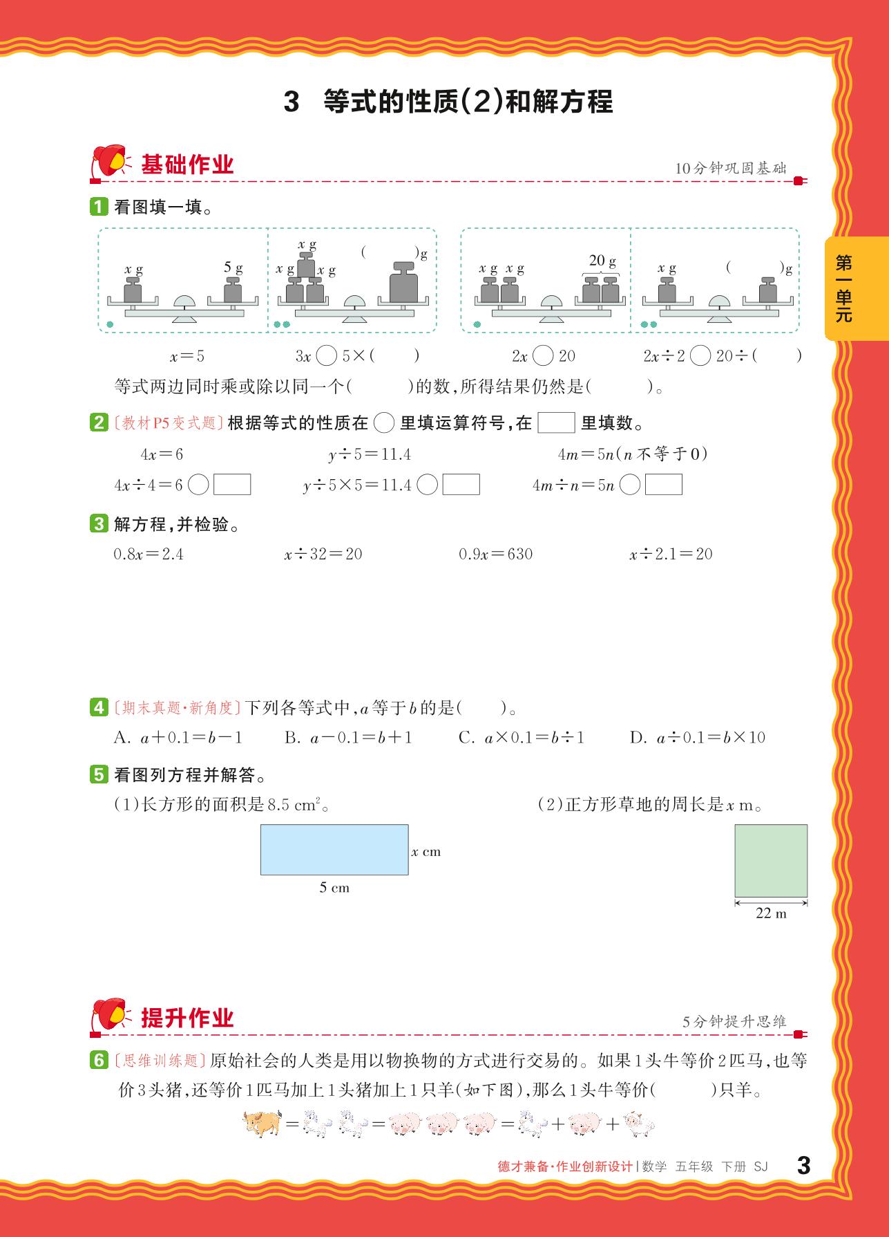 2024春下册五年级数学苏教版 第一单元 简易方程——3. 等式的性质(2)和解方程