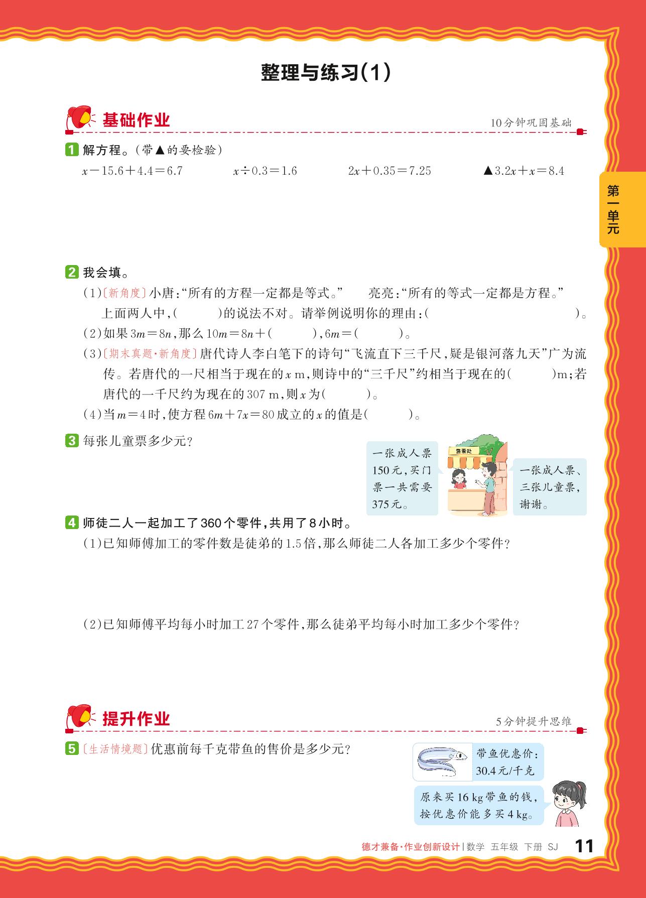2024春下册五年级数学苏教版 第一单元 简易方程——整理与练习(1)