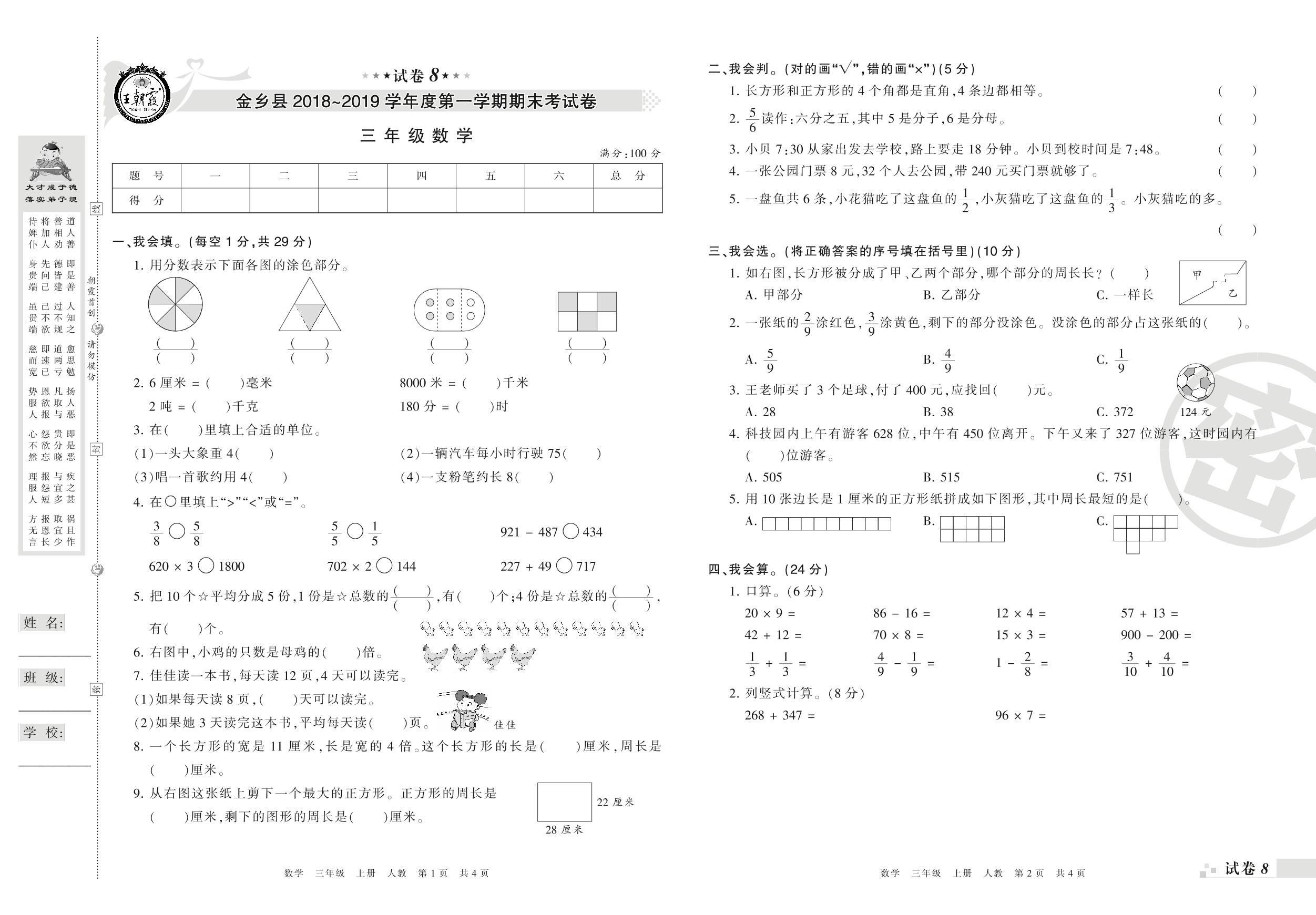 2018-2019学年第一学期济宁市金乡县三年级数学试卷(人教版)【8】
