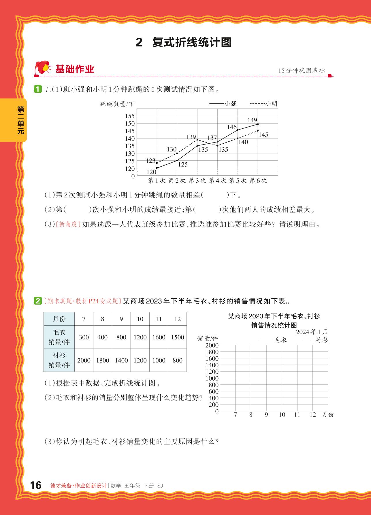 2024春下册五年级数学苏教版 第二单元 折线统计图——2. 复式折线统计图